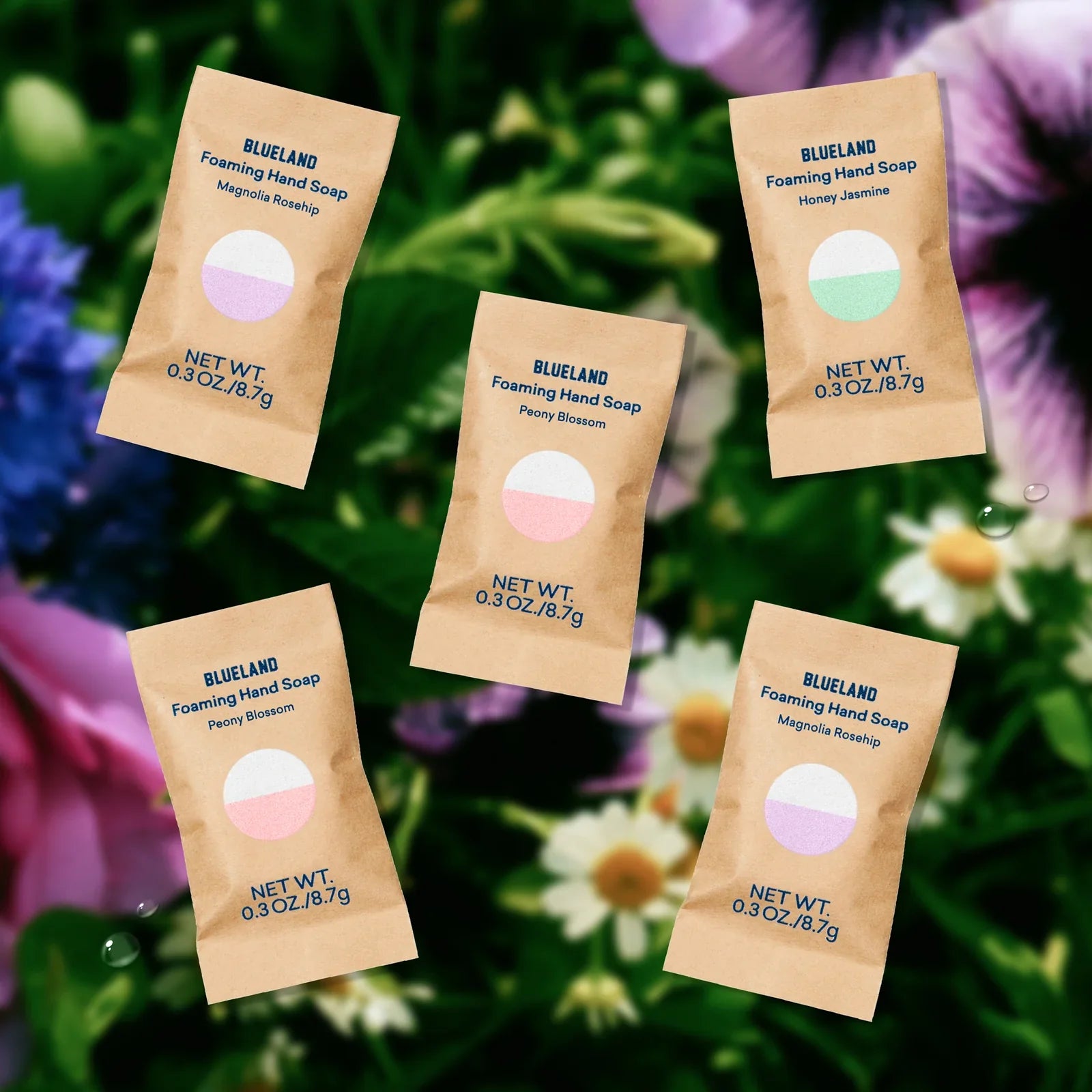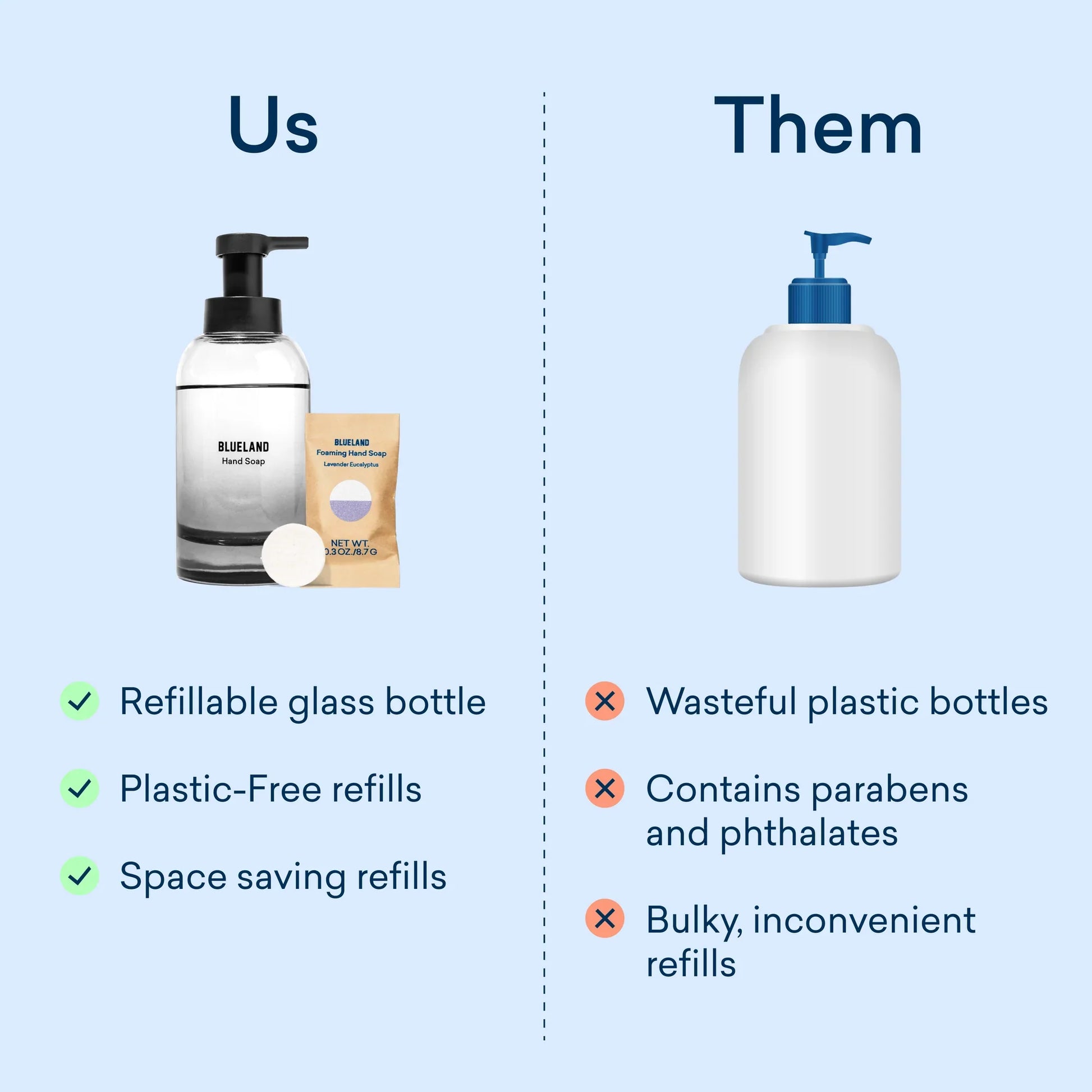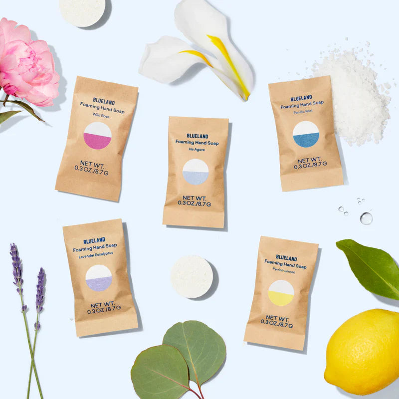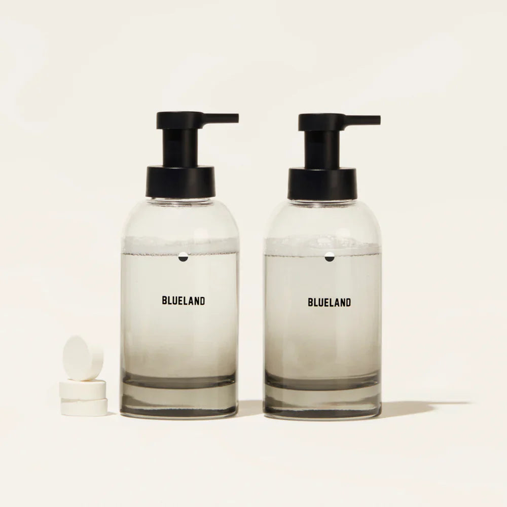 Hand soap set includes 2 Forever bottles and your choice of 5 or 10 plastic-free hand soap tablets. Each tablet makes one full bottle of Foaming Hand Soap.