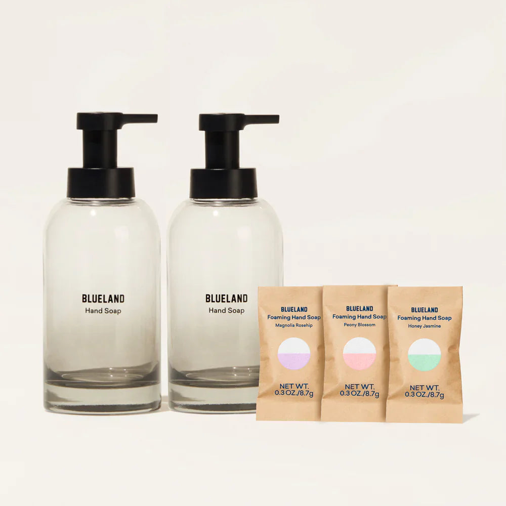 Hand soap set includes 2 Forever bottles and your choice of 5 or 10 plastic-free hand soap tablets. Each tablet makes one full bottle of Foaming Hand Soap.