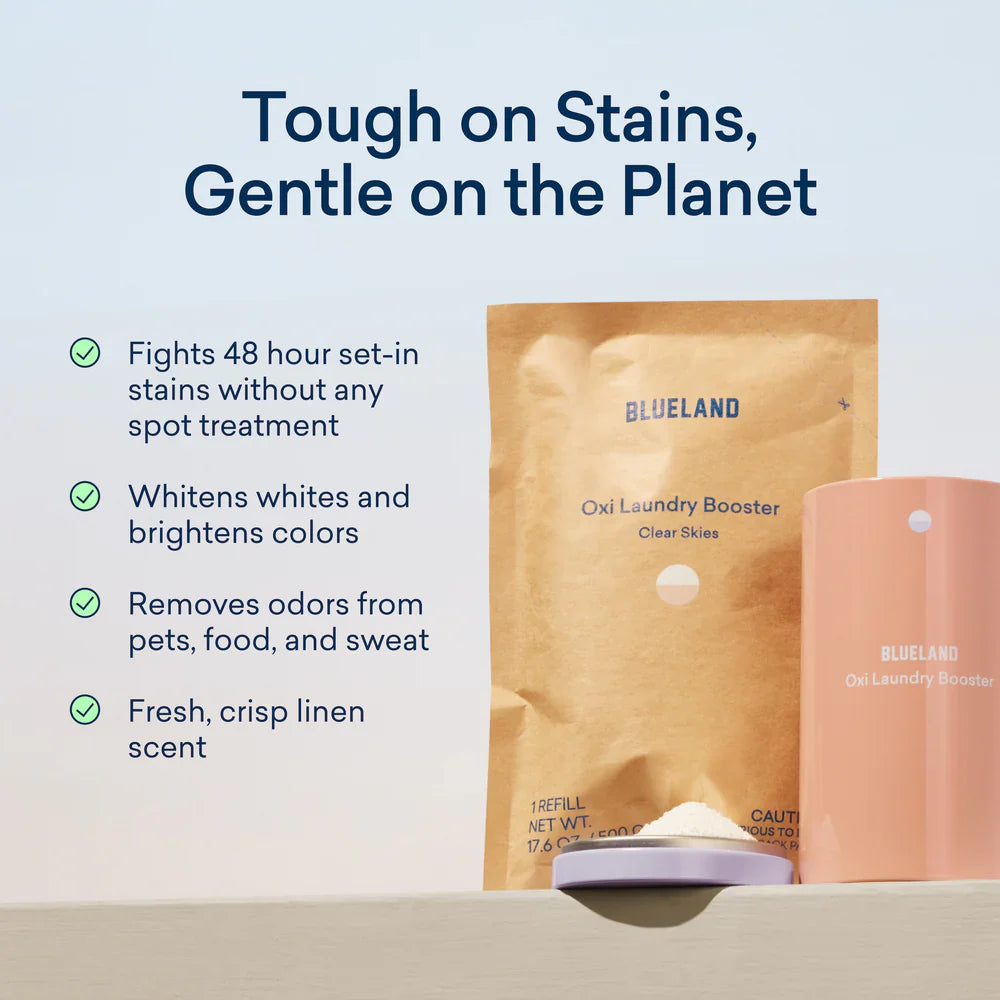 Stains have met their match. Our powerful and 100% plastic-free Oxi Laundry Booster helps lift stains, brighten whites, and remove odors in a single scoop.