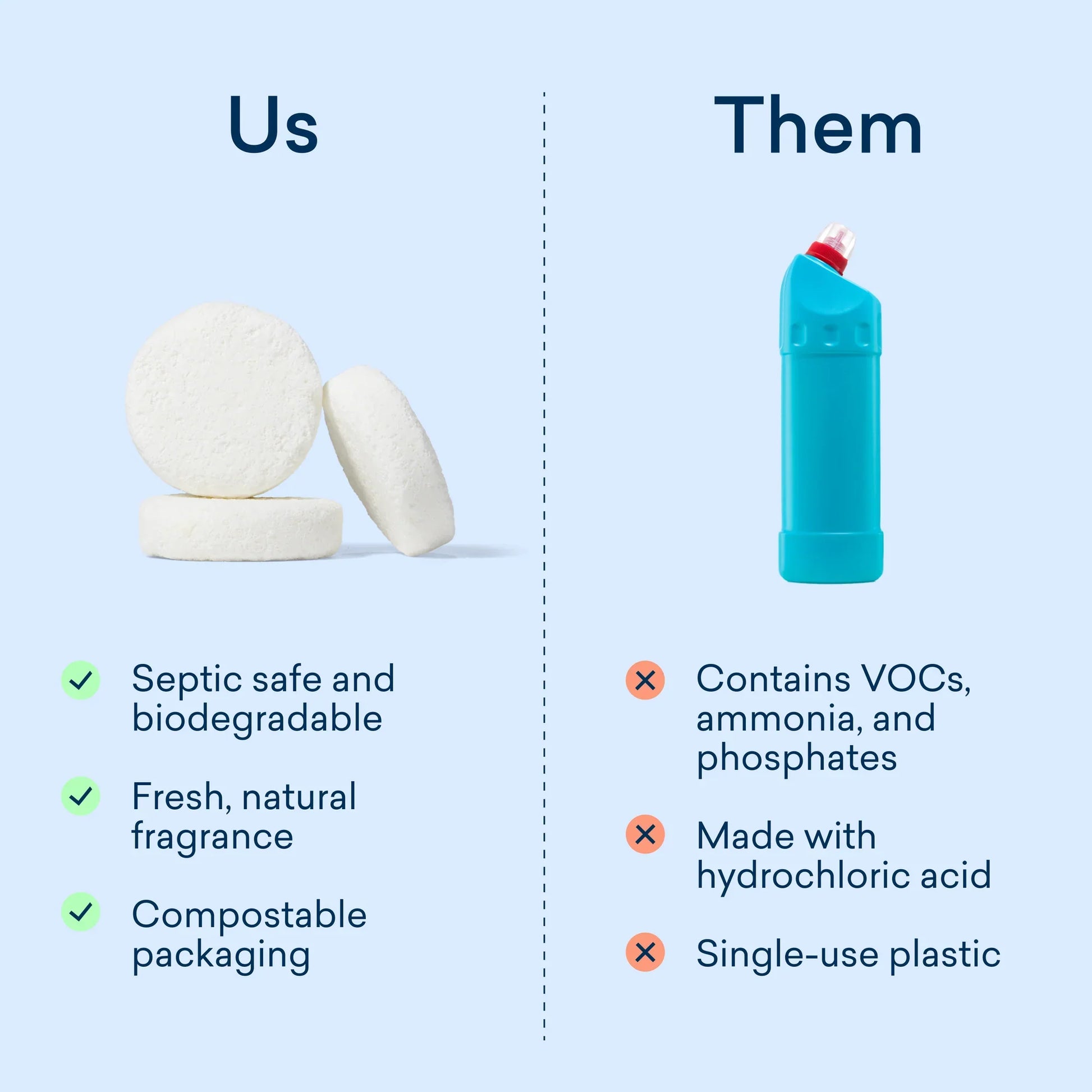 Overview Cleaning your toilet has never been easier—just drop, brush, flush! The first ever 100% plastic-free and zero waste toilet cleaning kit—made without harsh chemicals, harmful ingredients or plastic packaging. Our septic-safe, eco-friendly toilet cleaner tablets power through a range of tough toilet stains, including limescale, mineral deposits, hard water, and rust.