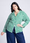 ELOQUII Item Number: Please select size 100% Cotton Relaxed fit Shirt collar, tie back Functional front placket with buttons Dropped shoulder Long sleeve with functional, button closure cuff Cutout at back Hits below the hip 29 1/2” from highest point of shoulder on size 18 Non-stretch woven poplin Machine wash cold gentle cycle with like colors. Only non-chlorine bleach when needed. Tumble dry low. Cool iron as needed.