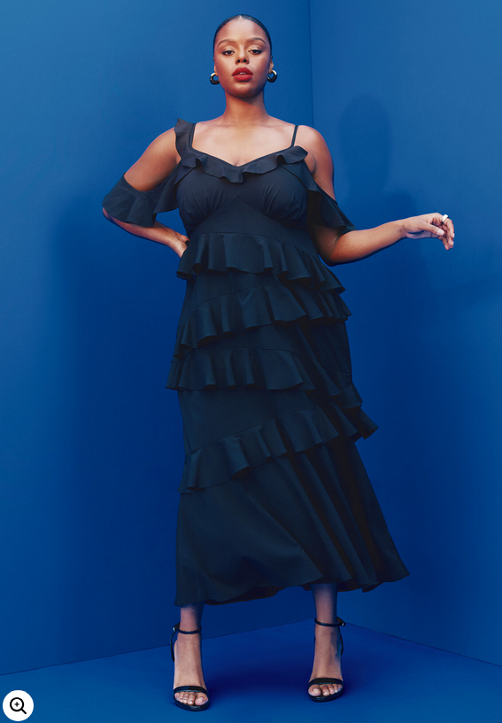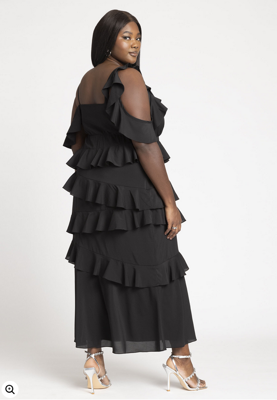 ELOQUII Item Number: Please select size 97% Polyester, 3% Spandex Close fit Fully lined Side zipper Adjustable straps Hits at the ankle Body length on size 18 is 57" Ruffle tiers Underbust shirring Stretch chiffon Machine wash cold gentle cycle with like colors. Only non-chlorine bleach when needed. Tumble dry low. Cool iron as needed.