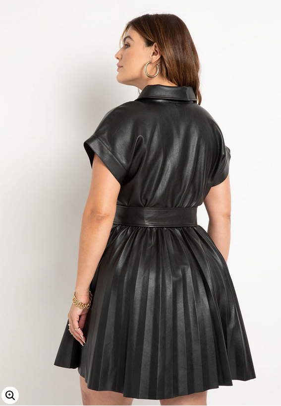 ELOQUII Item Number: Please select size Faux leather dress with pleated skirt easy fit on bodice elasticized waist seam pleated A line skirt dropped shoulder with self cuff front chest patch pockets shrank button down placket Hits at above knee Coating: 100% Polyurethane / Shell: 100% Polyester Care: Hand wash cold with like colors. Spot clean as needed. Do not dry clean. Do not tumble dry. Do not twist or wring. Lay flat to dry. Do not iron