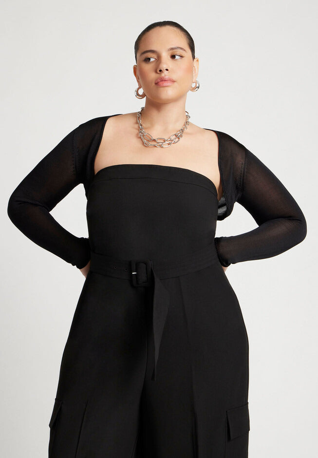 ELOQUII Item Number: Please select size 100% Viscose Viscose Unlined Fitted Open Front Bolero Sweater Bolero Pull On Long Sleeve Length 24.5" 12" Back Body Length on Size 18 Machine wash cold gentle cycle with like colors. Only non-chlorine bleach when needed. Do not tumble dry. Lay flat to dry. Cool iron as needed.