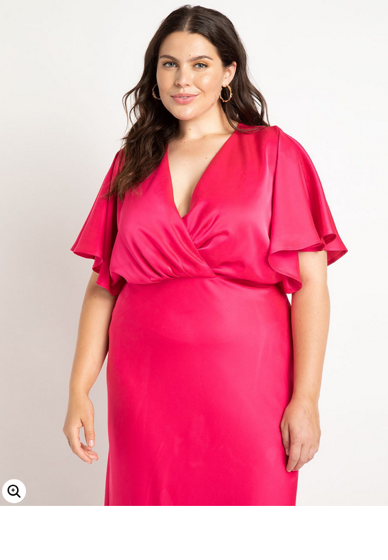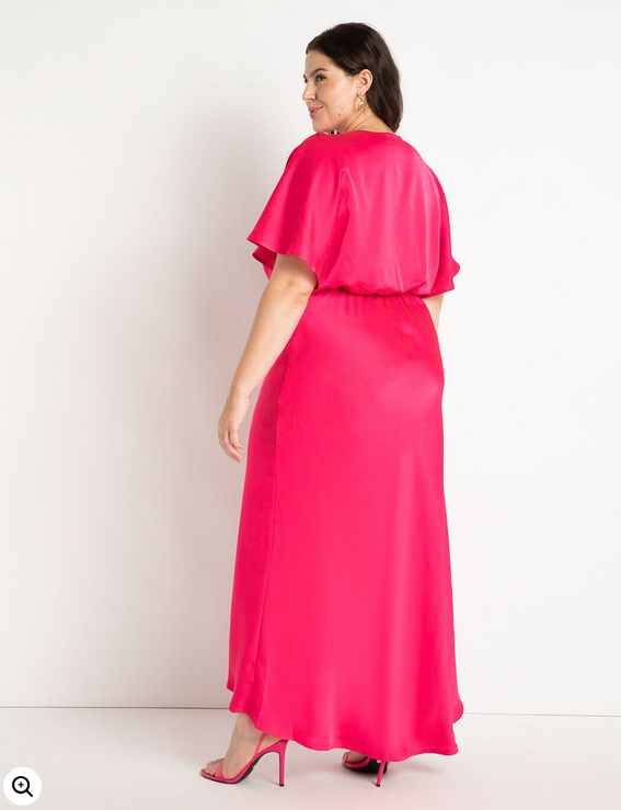 Kimono sleeve maxi dress easy & surplice bodice waist seam Trumpet A line skirt Invisible zipper closure Woven flowy satin Model is 5'10" size 14 Length on model is 54 1/2" shortest with 60 1/2" longest. 100% Polyester Care: Machine wash cold gentle cycle with like colors. Only non-chlorine bleach when needed. Tumble dry low. Cool iron as needed. Import