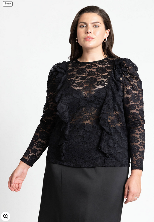 ELOQUII Item Number: Please select size 95% Nylon, 5% Spandex Snug fit Body is sheer Pull On, Crew neck, Back slit with button and bungee Long sleeve, Exaggerated puff sleeve Hits at the hip 27" body length on size 18 Stretch knit lace Machine wash cold gentle cycle with like colors. Only non-chlorine bleach when needed. Do not tumble dry. Lay flat to dry. Cool iron as needed.