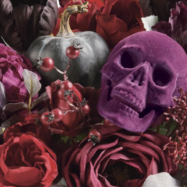 A closer look and your heart will beat just a little faster. A dark, velvety skull and black pumpkin are tucked among blood-red roses in this Halloween urn filler that feels perfectly conjured for that eerie-and-elegant, "my home is my haunted castle" vibe. It's a thrill every time you see it.