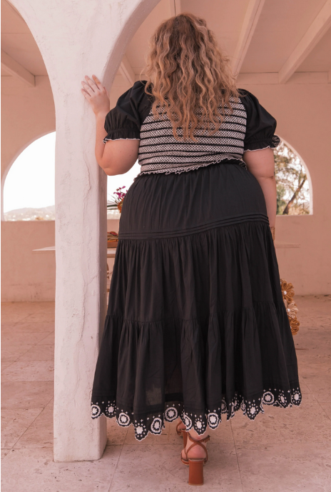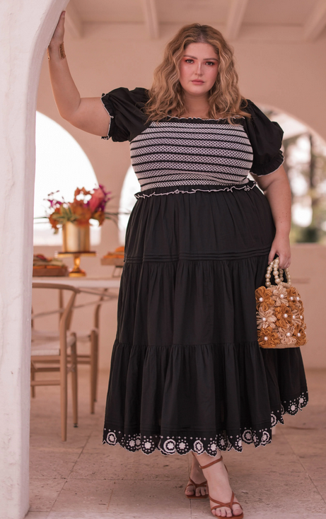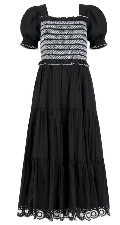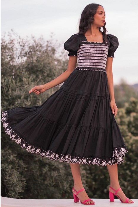 Indulge in breezy sophistication with our resort-ready black smocked dress, a summer essential with a touch of whimsy. Delicate white embroidery details the bodice, evoking seaside charm and playful elegance. Enhanced by puff sleeves, this ensemble exudes relaxed sophistication while the airy white eyelet design along the hem adds a touch of coastal allure, perfect for sipping refreshing drinks by the shore or exploring quaint beach towns with effortless style.Â