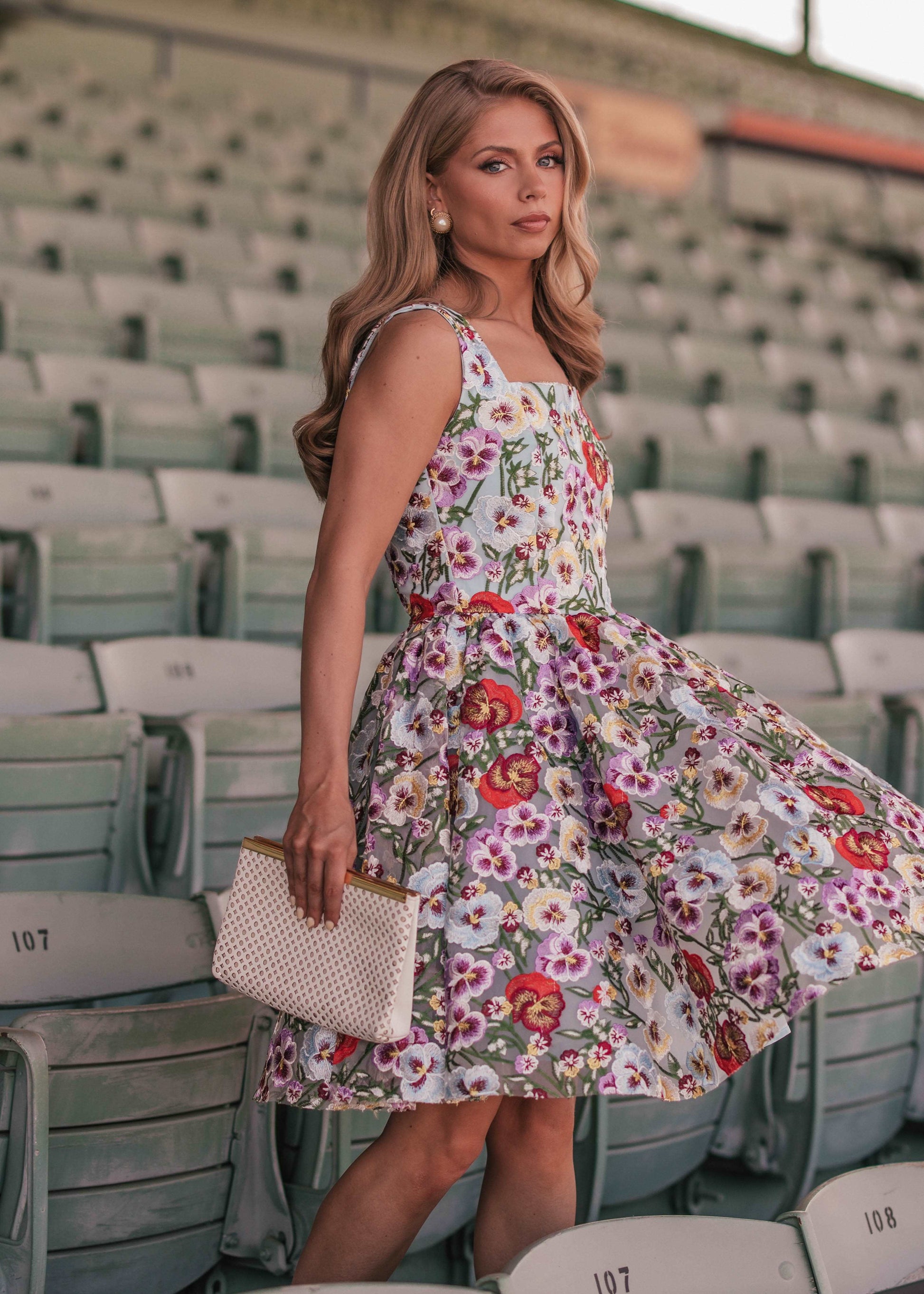Rule the room in the jewel of our Derby Collection. Adorned in a colorful pansy print, this floral mini is a tapestry of hues that evoke the romance of a garden in bloom. Its elegant charm and sophisticated frame pay homage to timeless class while a riot of vibrance makes this piece the perfect choice for an unforgettable statement. Wear it out to paint the town or dress it up for a formal event, and you'll be turning heads with every step!