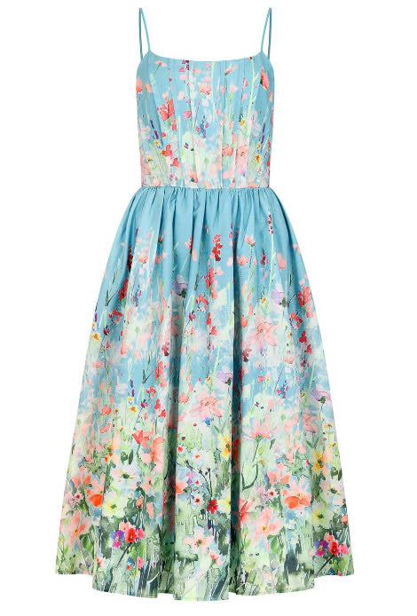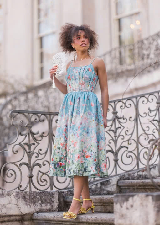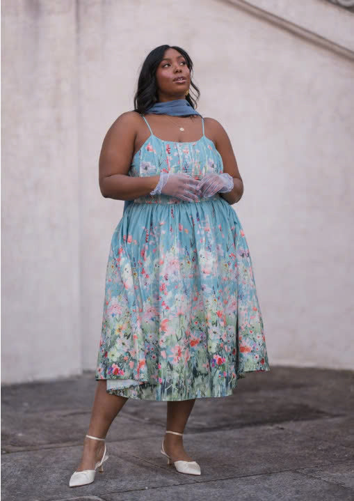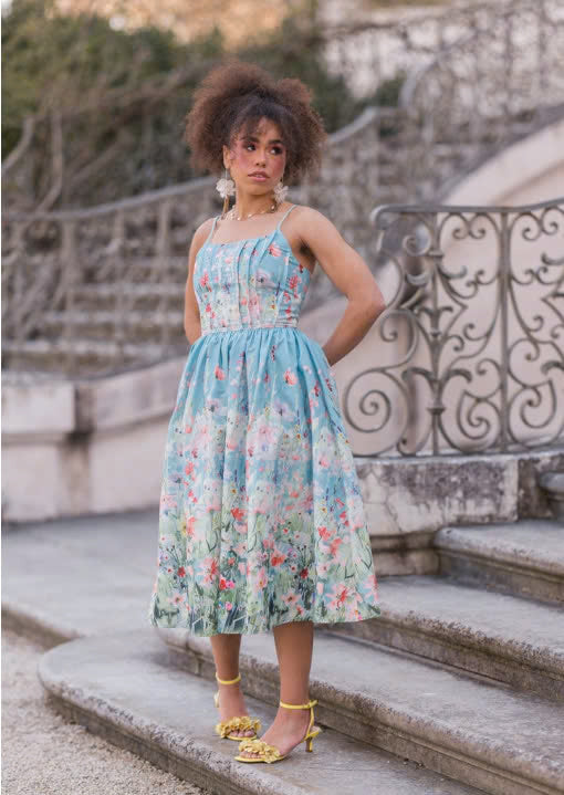 Canvas Of Pastel Dreams The Calista Dress is a vibrant celebration of nature, featuring a stunning watercolor- inspired floral print on a soft blue backdrop. With a fitted bodice, adjustable spaghetti straps, and a flowing A-line skirt, this dress is as comfortable as it is eye-catching. Perfect for sunny days, garden parties, or any occasion that calls for a touch of whimsical beauty. • Square neckline •Adjustable straps • Pleated bodice • Fitted waistline • Back zipper • Pockets • True to size