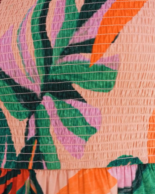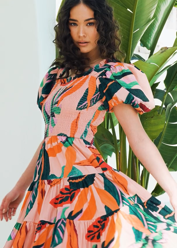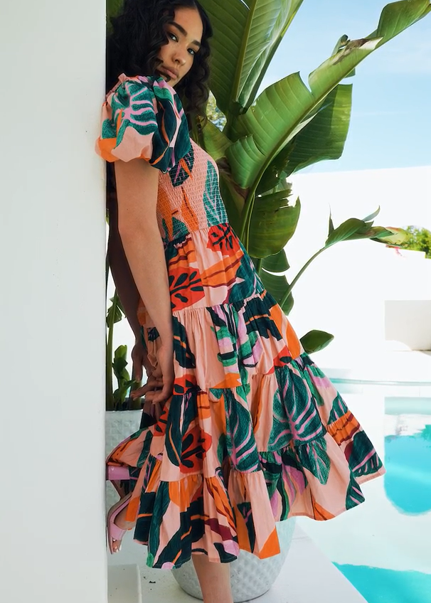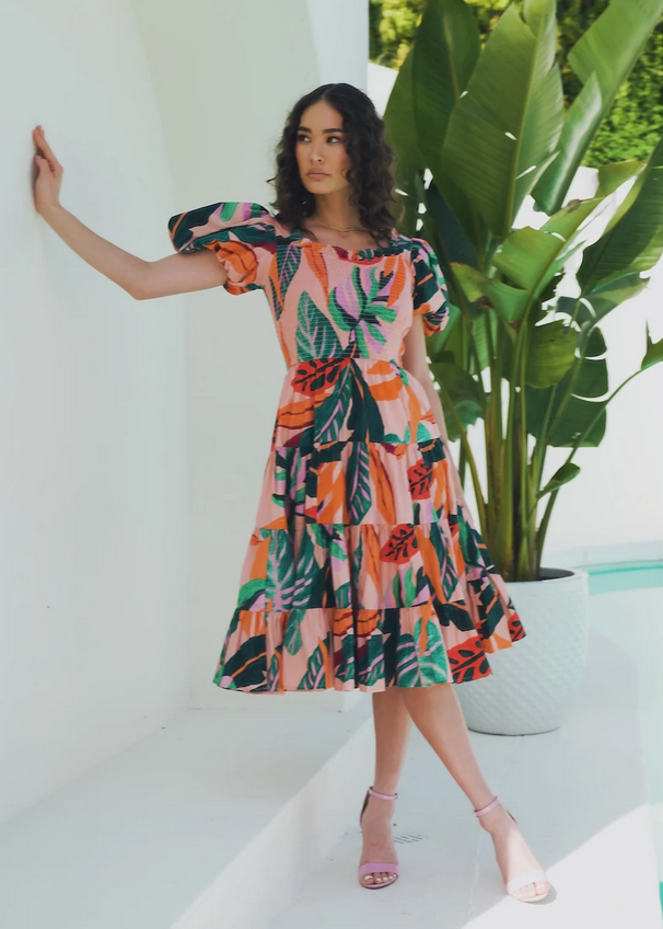 Find Me Under The Palms Step into a tropical haven with our pink tiered puff sleeve dress, adorned with a lush palm leaf print in vibrant shades of green, peace, and orange. The smocked bodice accentuates your figure, while the puff sleeves add a touch of playful charm. Perfect for coastal getaways or sunny seaside strolls, this dress exudes an earthy, botanical elegance that will make you feel like you're surrounded by nature's beauty wherever you go.