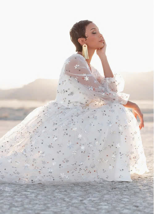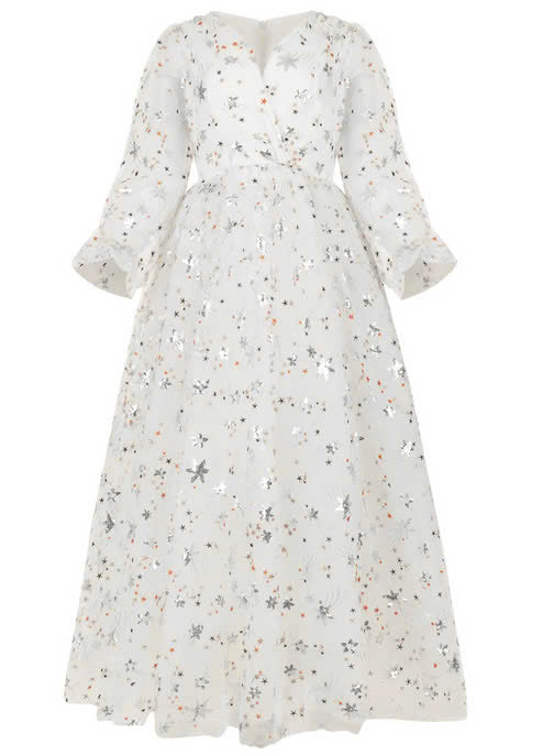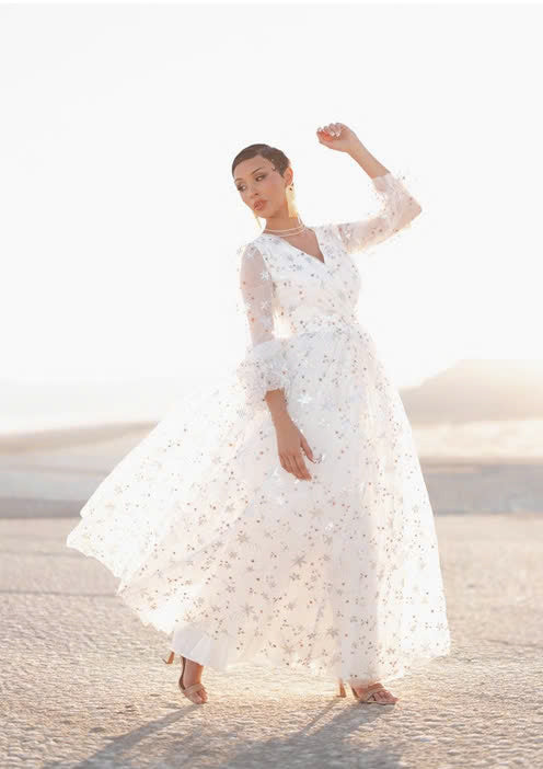 Twirl under the stars in the Celestia Dress. Available in both white and yellow, this gown is adorned with shimmering silver and gold stars that bring a touch of magic to every occasion. With its ethereal flow and delicate detailing, the Celestia Dress is perfect for holiday gatherings, New Year's Eve, or any night where you want to SHINE. Embrace the night sky in this celestial masterpiece!