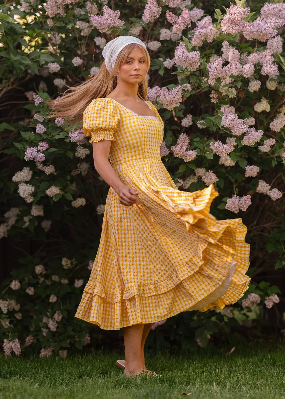 The Dorothy Dress is pure sunshine wrapped in gingham. With its cheerful yellow color, elastic puff sleeves, and playful ruffle hem, this dress radiates joy and vintage charm. The easy, breezy silhouette is as comfortable as it is eye-catching—perfect for picnics, farmers markets, or twirling barefoot in the grass. It’s the kind of dress that turns everyday moments into golden memories. For a sleeveless version of our Dorothy Dress, shop the Daze Dress in Yellow.