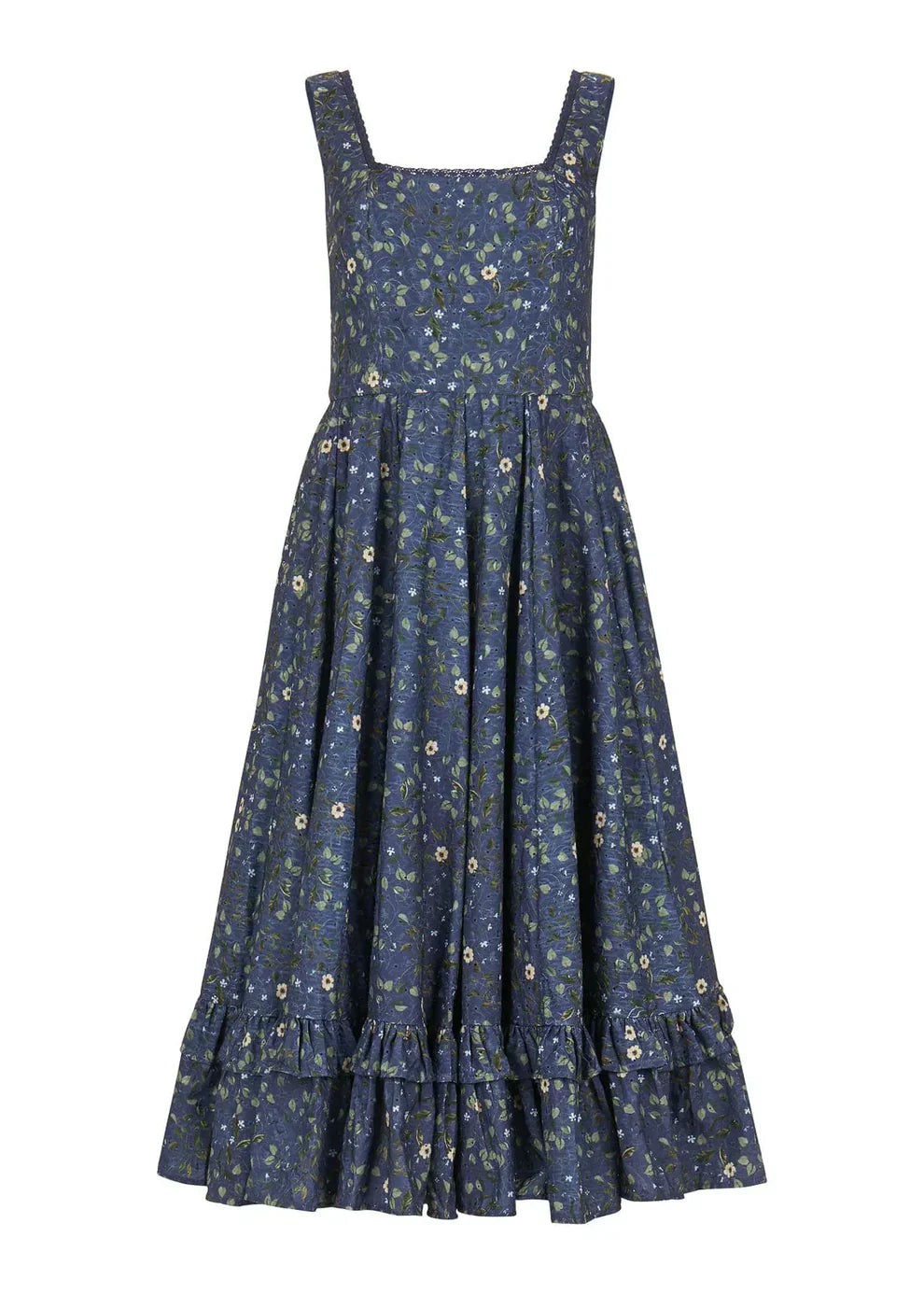 The Eve Dress is a charming and versatile piece, featuring a delicate floral print on a deep navy backdrop. Designed with a square neckline, fitted bodice, and a flowing skirt with ruffle detailing at the hem, it offers a touch of effortless elegance. Perfect for casual outings or garden strolls, this dress combines comfort and style for any occasion. Same silhouette as our best-selling Daze Dress.Â