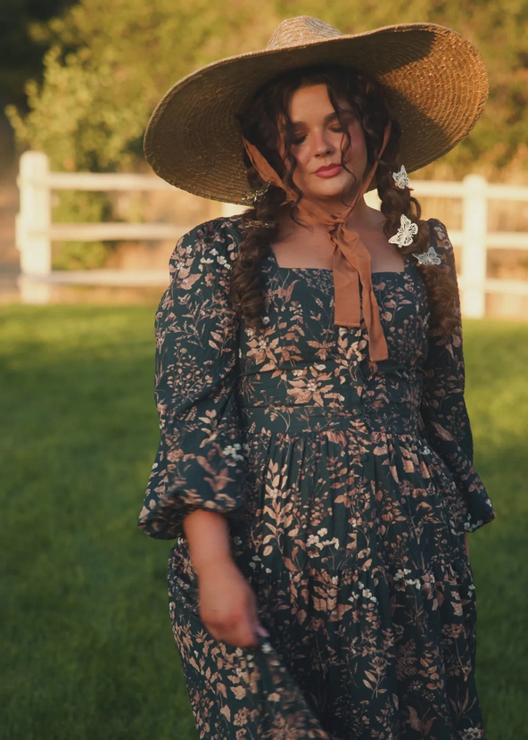 True to its name, the Fern dress features a golden fern print against a lush, dark green background. This nature-inspired gown features a flattering square neckline and voluminous puff sleeves that add a touch of vintage elegance to this striking design perfect for any fall occasion!