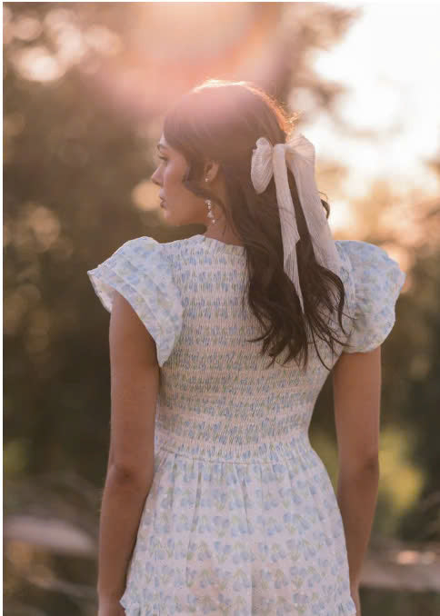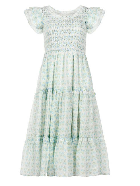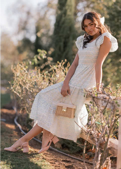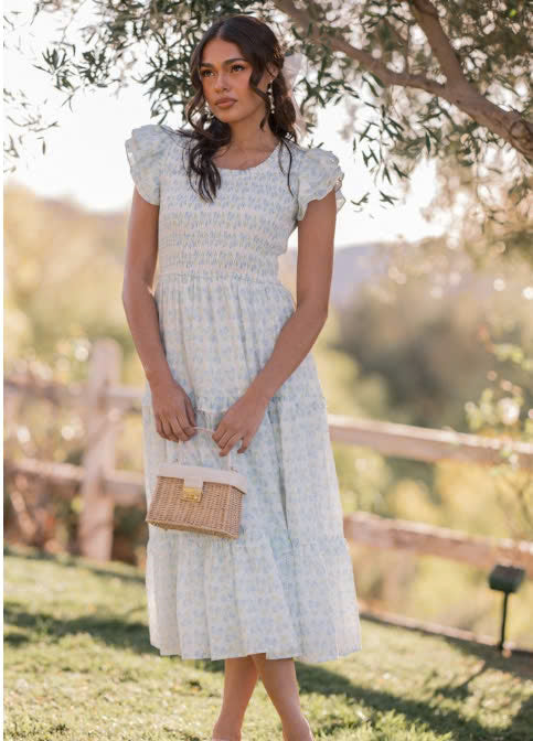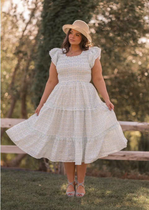 Brunch Date The Florette Dress is a graceful celebration of delicate floral charm. Featuring a smocked bodice, flutter sleeves, and a tiered skirt, it offers a flattering silhouette with effortless comfort. The intricate floral pattern and eyelet detailing make it ideal for garden parties, tea time, or any special occasion. Add a touch of whimsy to your wardrobe with this dreamy design. • Smocked bodice • 3-tier flutter sleeve • Pockets • Recommend sizing down