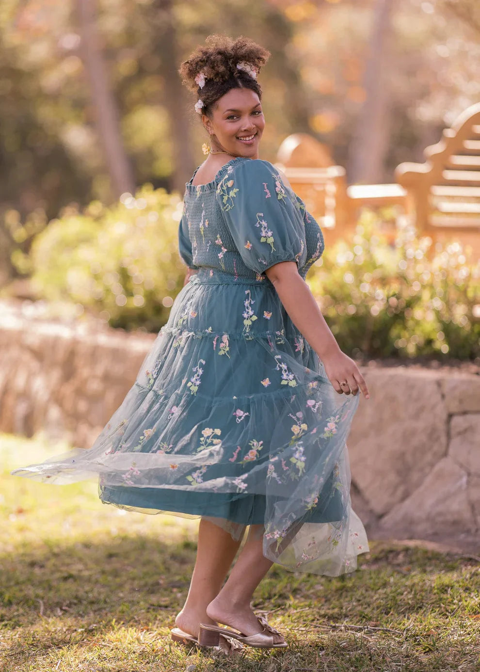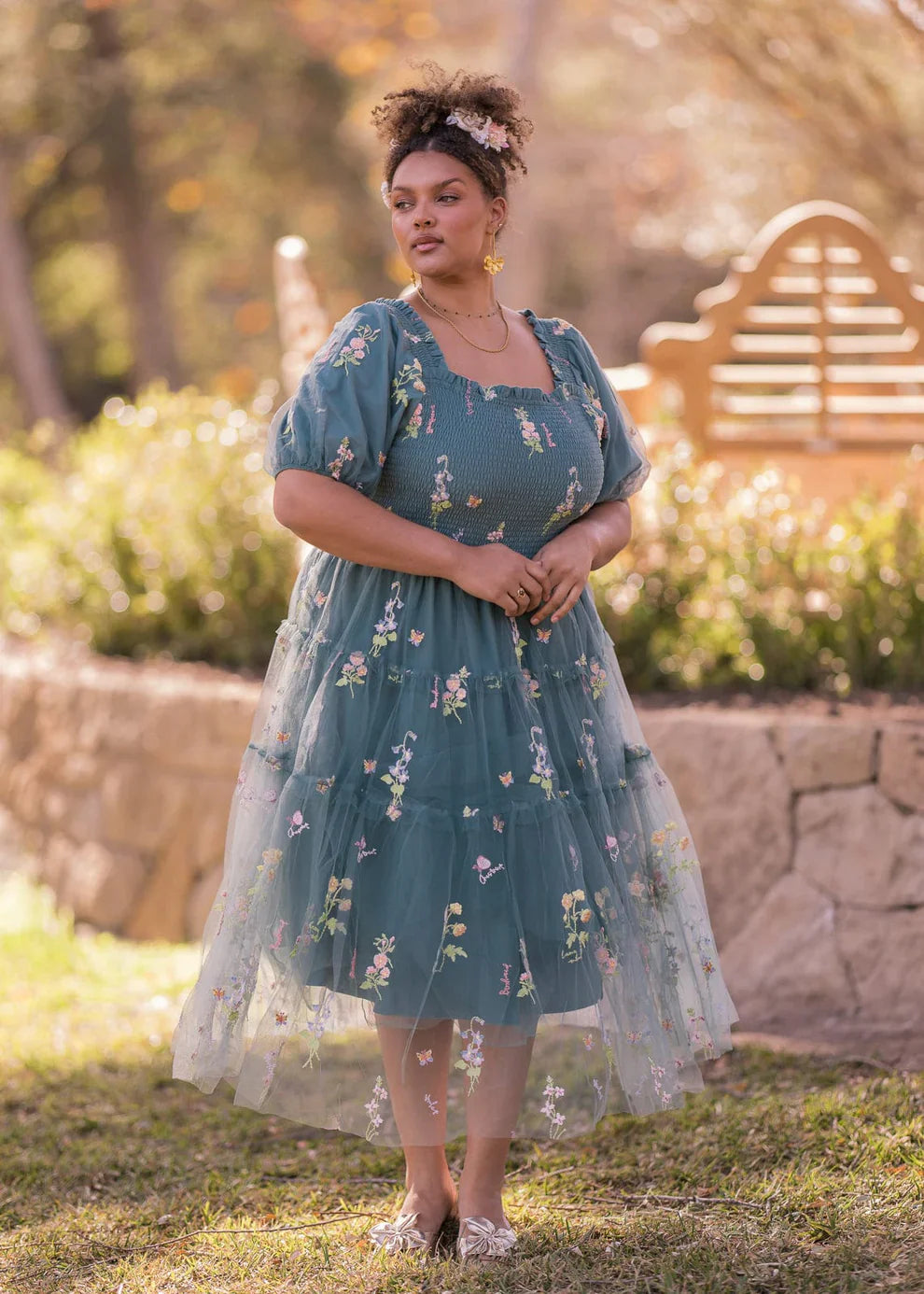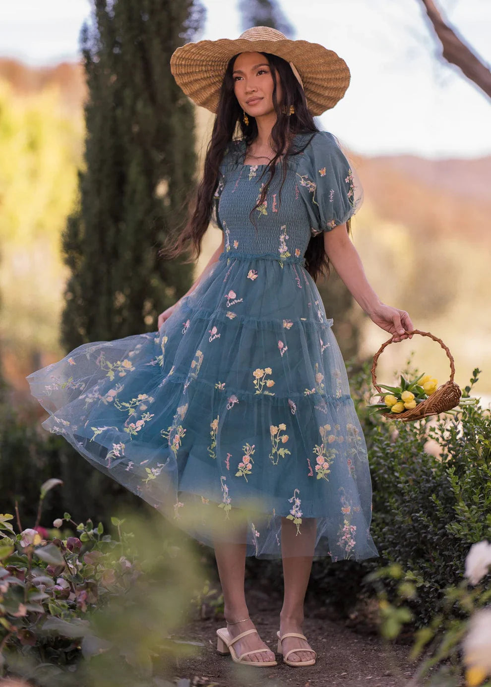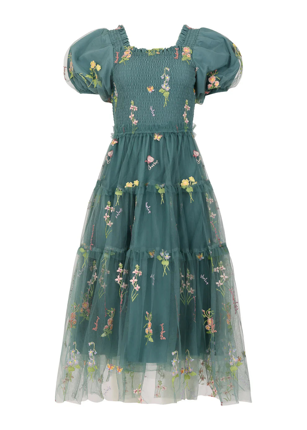 The Talia Dress features the same beloved silhouette as our best-selling Rose Dress, with a smocked bodice, voluminous puff sleeves, and a flowing tiered skirt. Delicate floral embroidery and whimsical butterfly details add a touch of enchantment, making this dress feel like a fairytale dream. Crafted from airy tulle, it’s perfect for garden parties, special occasions, or any moment you want to feel effortlessly elegant.