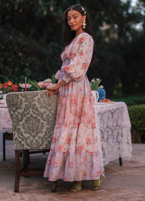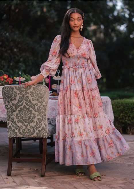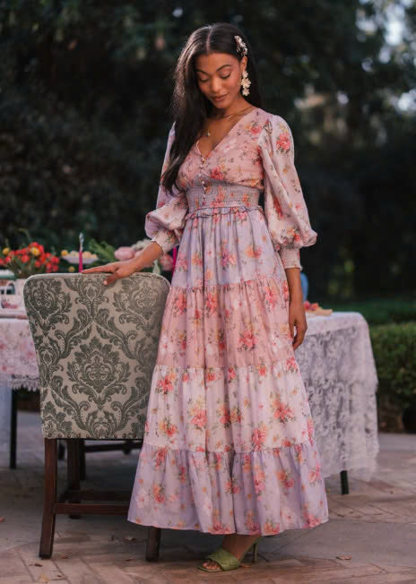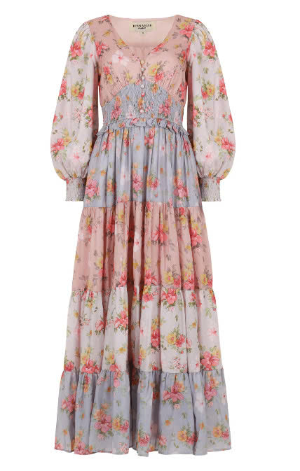 The Garden Rose Dress is a breathtaking blend of romantic charm and effortless elegance. Featuring a tiered maxi silhouette adorned with delicate pink and blue floral prints, it radiates timeless beauty. Smocked details at the waist and cuffs ensure a flattering and comfortable fit, while the button-down bodice adds a vintage-inspired touch. Perfect for tea parties, garden strolls, or any occasion where you want to feel utterly enchanting.