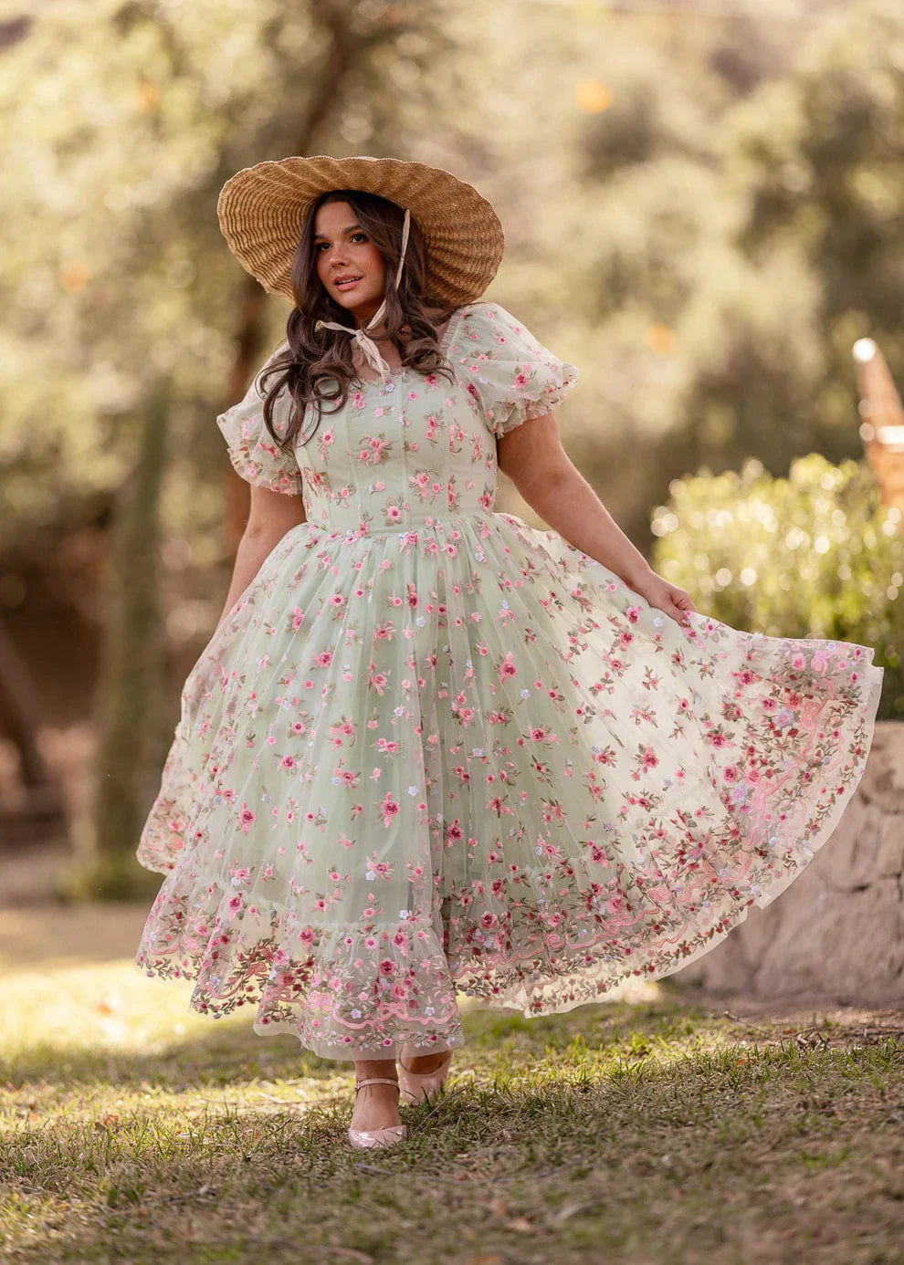 The Rosalie Dress is a fairytale come to life, featuring delicate floral embroidery over a soft sage-green tulle. With its romantic puff sleeves, fitted bodice, and flowing tiered skirt, this dress is designed for dreamy elegance. Intricate bow embroidery along the hem adds an extra touch of whimsy, making it perfect for garden parties, special occasions, or twirling under the stars. Embrace your inner romantic with this enchanting, vintage-inspired masterpiece.