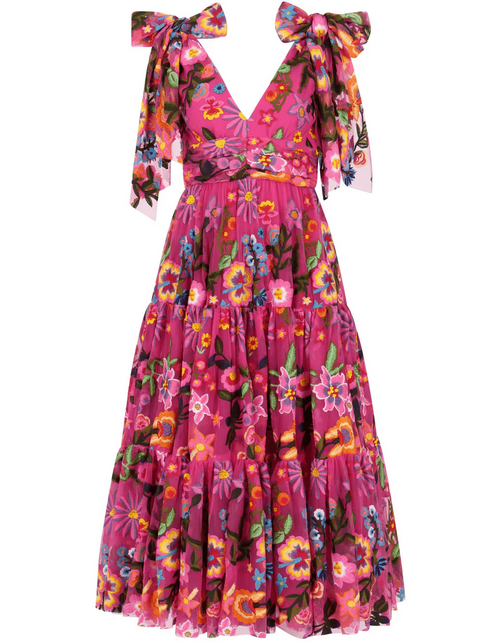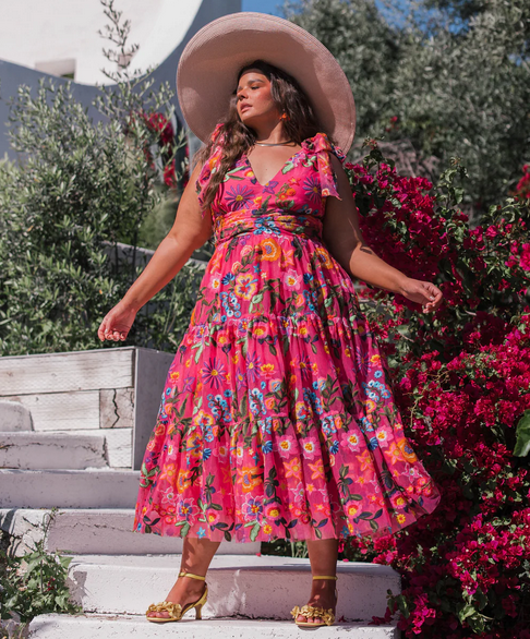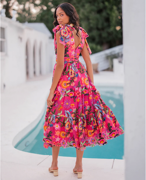 Introducing our enchanting "Hibiscus" dress, the crown jewel of our Paradise Collection. This v-neck wonder boasts a passionate fuchsia tone, adorned with a burst of mystical tropical floral embroideries in a vibrant rainbow palette. With its tie sleeves adding a touch of romance, this dress evokes the essence of colorful joy, making it a magical choice for any occasion. Let the allure of hibiscus blooms transport you to a world of tropical splendor wherever you go.