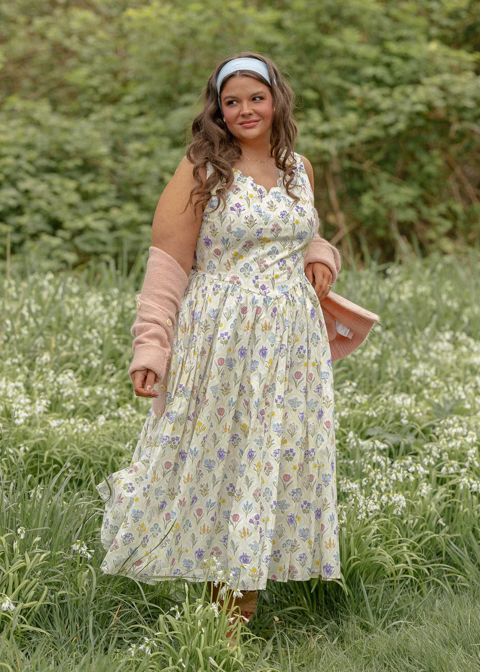 Step into a storybook summer with the Nantucket Grove Dress. This darling design features a cream backdrop adorned with a charming garden of pastel florals in lavender, blush, and buttercup hues. With its classic sleeveless cut and full, twirl-ready skirt, it’s perfect for sunny days, tea parties, and everything in between. Sweet, simple, and oh-so-whimsical—this dress captures the magic of a blooming countryside.