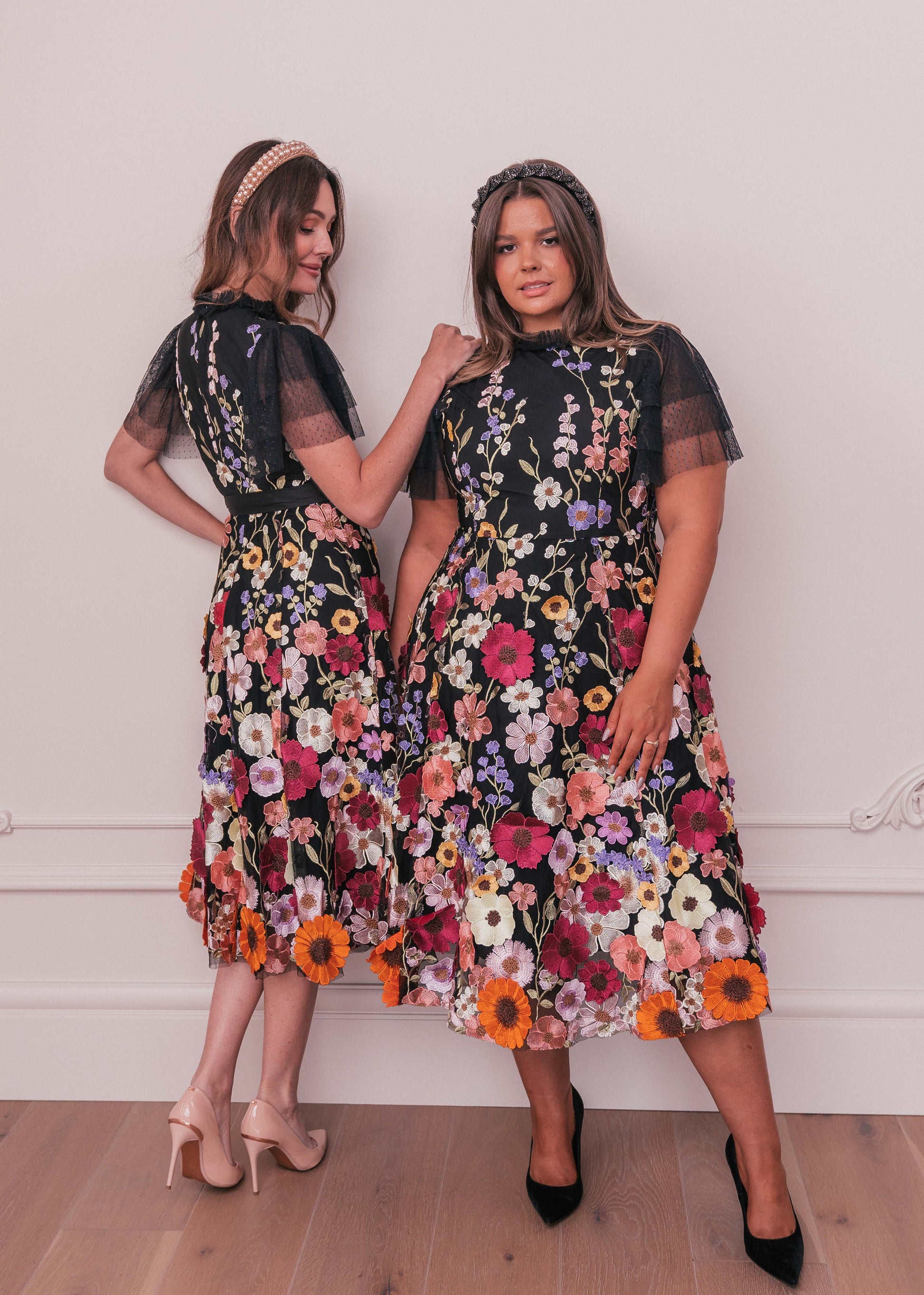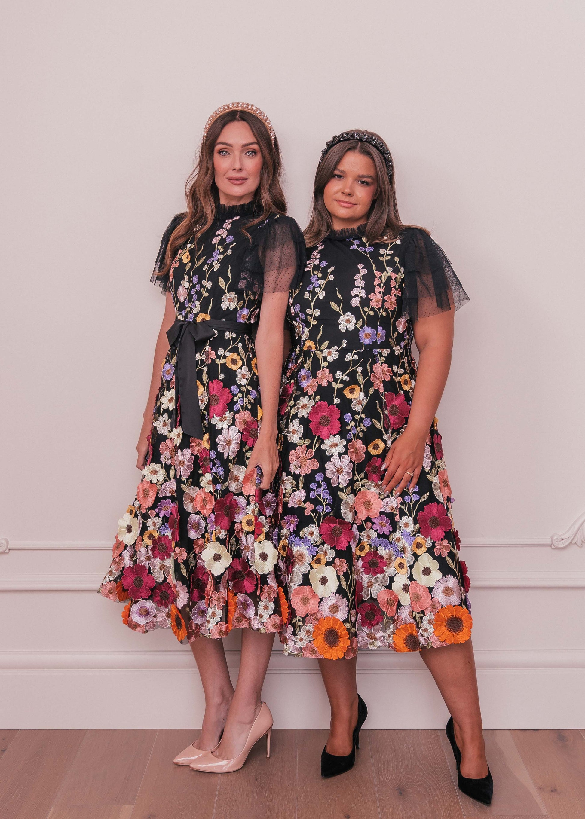 A timeless piece to wear on any occasion. Hand-embroidered flowers adorn this whimsical style’s swiss dot flutter sleeve, while a tie at the waist adds feminine flair. The fitted bodice and flared skirt add to the fullness of its A-line silhouette.
