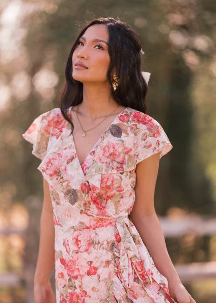 The Daphne Dress is a blooming work of art, where vintage charm meets modern romance. With its flattering wrap silhouette and flutter sleeves, it’s designed to make every moment feel effortlessly graceful. Draped in vibrant florals, this dress feels like stepping into a painting—perfect for garden parties, dreamy escapes, or moments worth remembering.