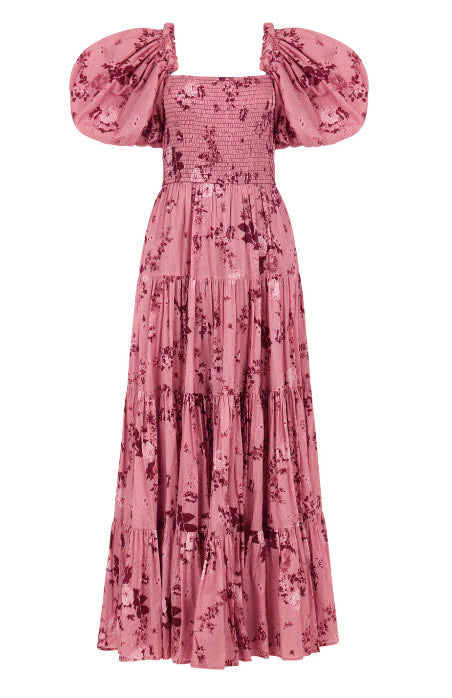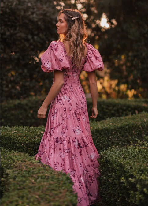 Wandering Free The Luna Dress is your ultimate companion for dreamy outings and cherished moments. Featuring a smocked bodice and voluminous puff sleeves, its enchanting pink floral print radiates elegance and charm. Whether you're strolling through a farmers market, enjoying a picnic, or catching up with friends over brunch, this dress effortlessly combines comfort and style. Its tiered skirt ensures a graceful twirl, making every step picture-perfect. • Square neckline • Elastic puff sleeve • Smocked bodice • Tiered skirt • Pockets