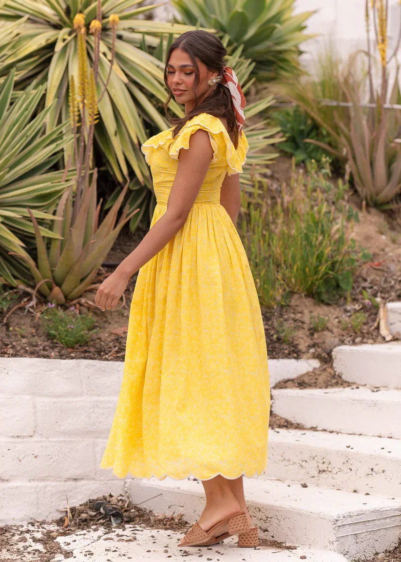 Sunny Hunny The Marisol Dress is pure sunshine in dress form, featuring a soft yellow floral print that radiates joy. With flutter sleeves, a sweet scalloped neckline, and a twirl-worthy skirt, it’s both playful and elegant. The scalloped hem adds a touch of charm, making it perfect for sunny celebrations or everyday magic. Light, bright, and effortlessly lovely—just like you.