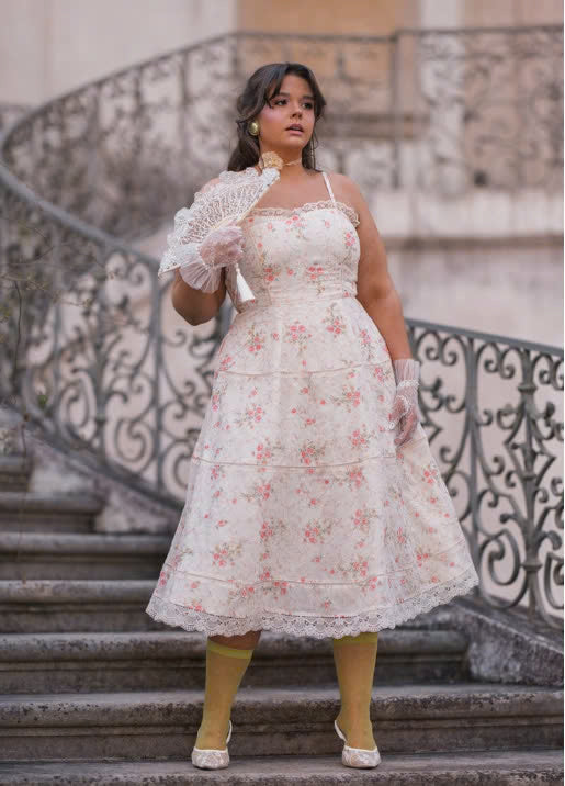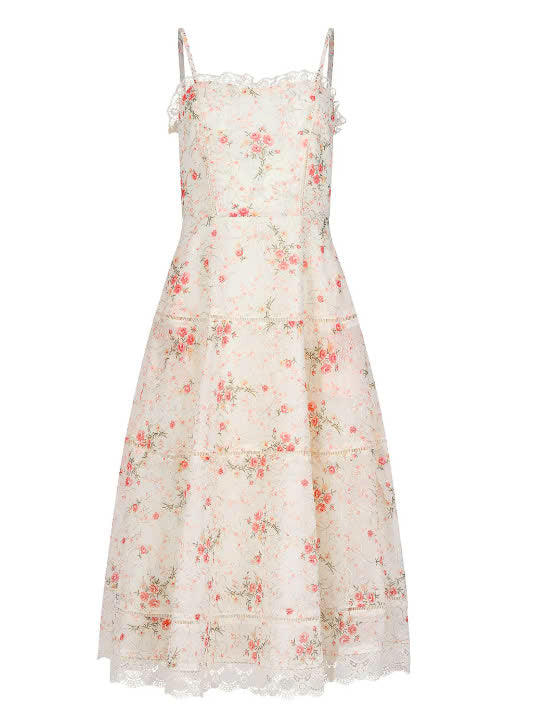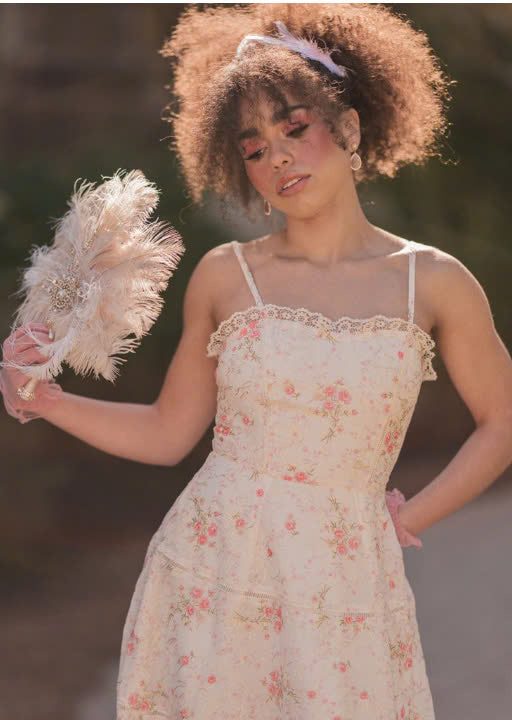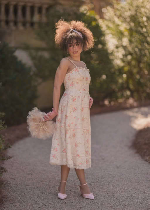 Chasing Light & Lace The Primrose Dress is a romantic blend of vintage charm and delicate details. Featuring a soft floral print with intricate lace trim and tiered accents, this dress captures timeless elegance. Adjustable spaghetti straps and a flattering silhouette make it a perfect choice for garden parties, tea gatherings, or summer celebrations. Its effortless grace ensures you'll feel both comfortable and enchanting. • Sweetheart neckline • Adjustable straps • Back zipper • Pockets • True to size