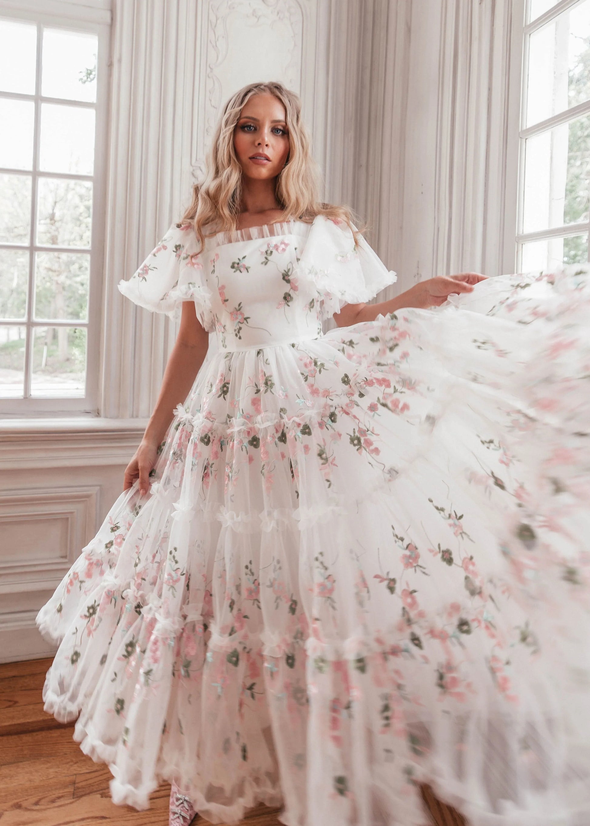 Fit for any bridal event, this twirly, flowy, flowery gown was made for lively joy. Floral appliqués in pink add playful femininity, and ruffles line the neckline and the hem for extra flair. This dress is best for a bride prepared to dance! A captivating choice for both a touch of whimsy and romance, she promises to dazzle!