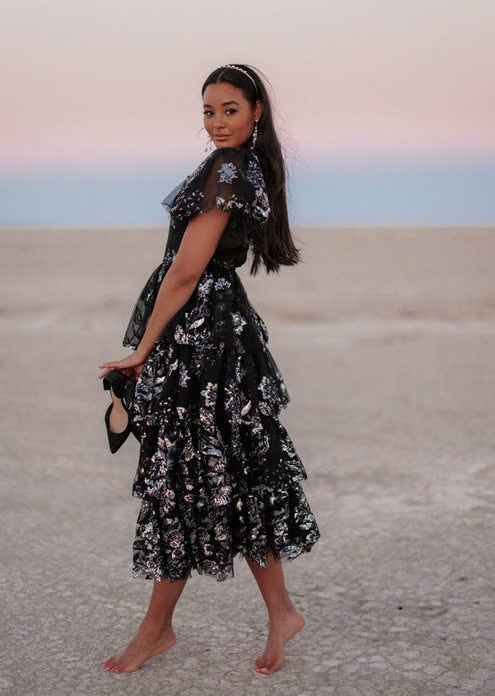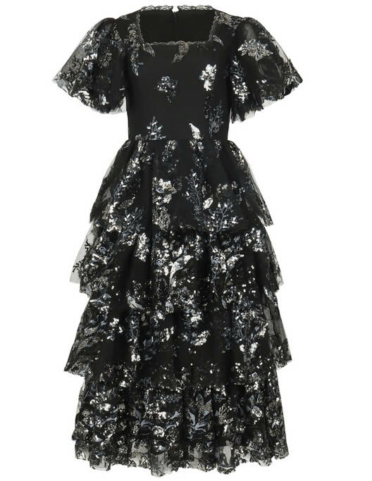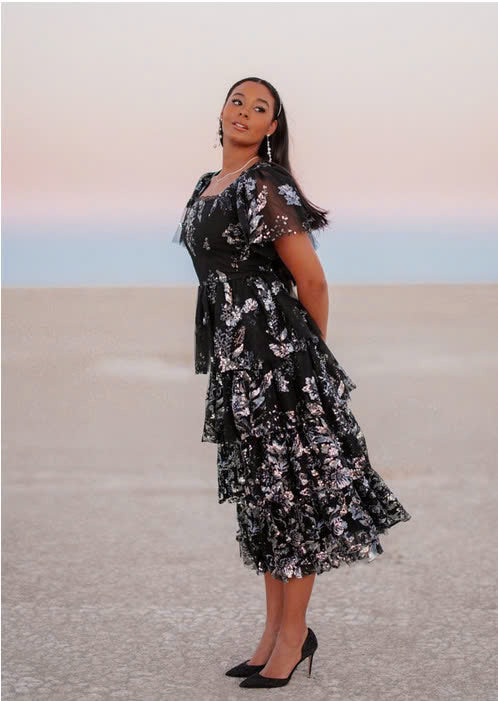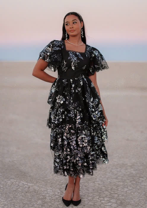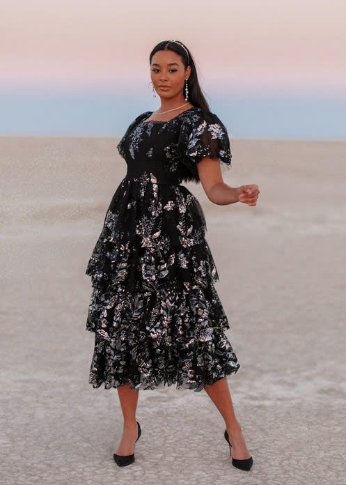 Love You To The Moon And Back The Selena Dress is a stunning statement piece, featuring layers of shimmering black fabric adorned with silver floral detailing. Its flutter sleeves and tiered ruffles create a romantic, ethereal silhouette, perfect for making an entrance at any special event. With its square neckline and eye-catching sparkle, this dress is designed for those who want to outshine the stars one sequin at a time. • Lace square neckline • Tulle flutter sleeve • Fixed waistline • Back zipper • 3-tier skirt • Fitted from bodice to mid hip