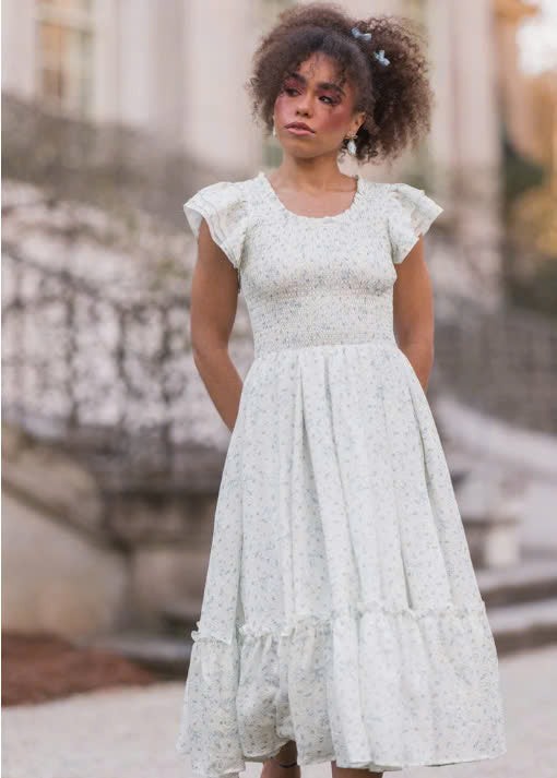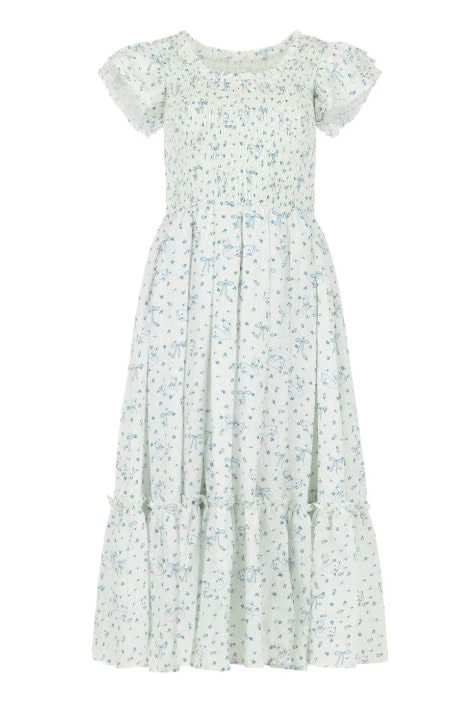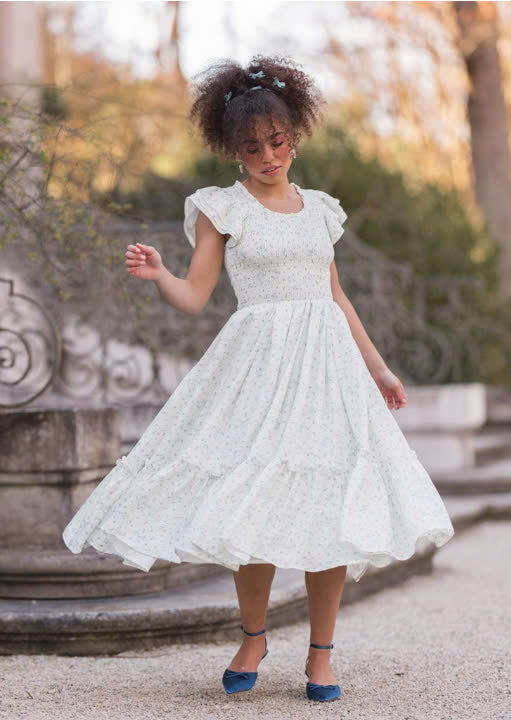 Like A Dream The Swan Serenade Dress is a charming and elegant piece, featuring a delicate blue swan print on a soft ivory background. Designed with a smocked bodice, flutter sleeves, and a ruffled hem, it offers a blend of comfort and graceful style. Perfect for sunny days, picnics, or special outings, this dress exudes timeless beauty and whimsical charm. • Round neckline • Smocked bodice • 3-tier flutter sleeve Recommend sizing down