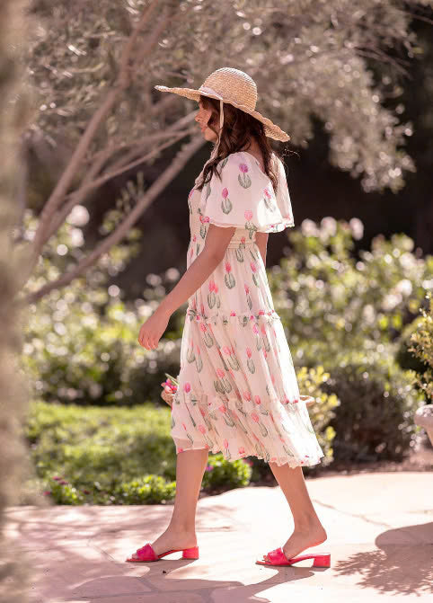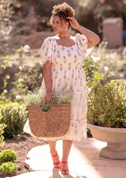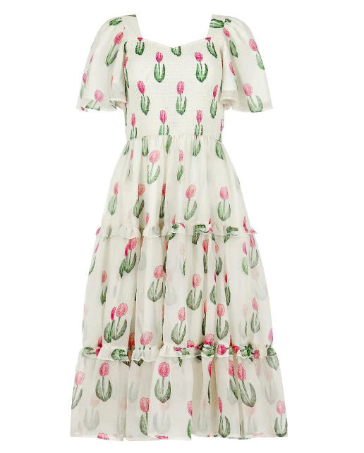 Embrace the charm of spring with the Tulip Fields Dress, a sweet and whimsical design perfect for any sunny day. Adorned with delicate pink tulips and lush green stems on a soft ivory base, this dress captures the beauty of a blooming garden. The smocked bodice offers a flattering fit, while the flutter sleeves and tiered skirt add a playful, romantic touch. Whether you're strolling through flower fields or enjoying a picnic, this dress is made for dreamy moments.