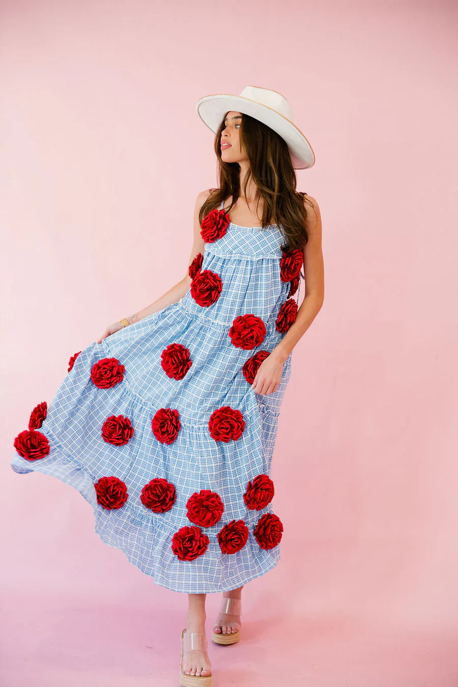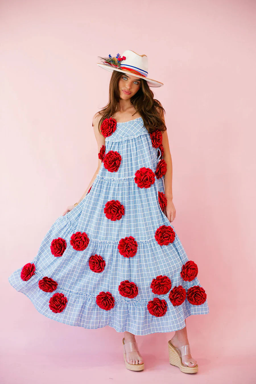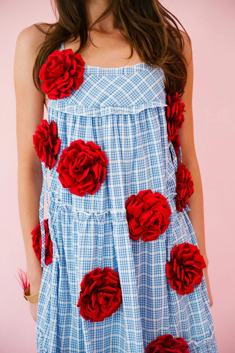 Elevate your summer style with our Beach Rose Maxi Dress! This gorgeous blue gingham dress features stunning red rose patches that add a pop of color and femininity to your look. Perfect for any sunny occasion, this dress will have you feeling confident and beautiful.