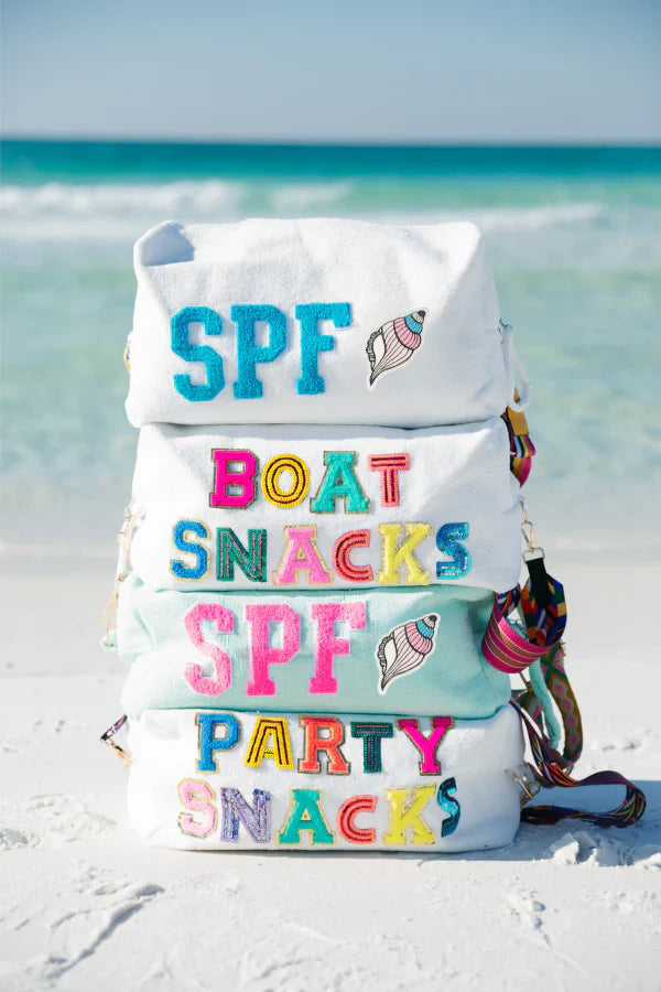 Made from Terry Cloth Material Zipper Closure Added on straps are adjustable Has an inside pocket