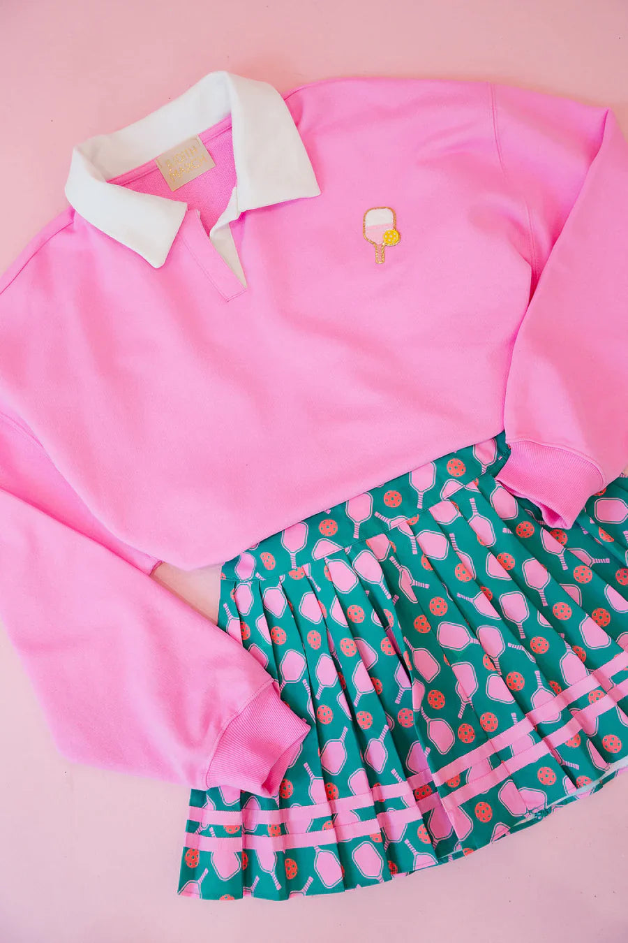 Serve up some style with our Pickleball Athletic Skirt! This dark green pleated skirt features a playful design of pink pickleball paddles, making it perfect for any athletic activity. Stay trendy and comfortable while showing off your love for the game.