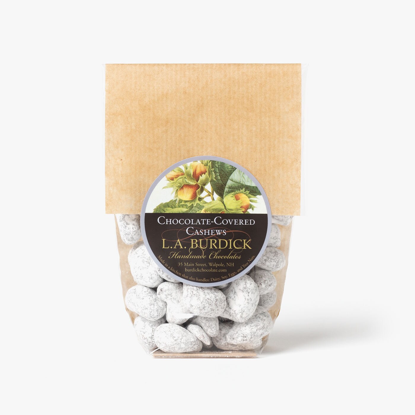 Creamy roasted cashews are coated with our velvety dark chocolate and complemented with a dusting of powdered sugar.
