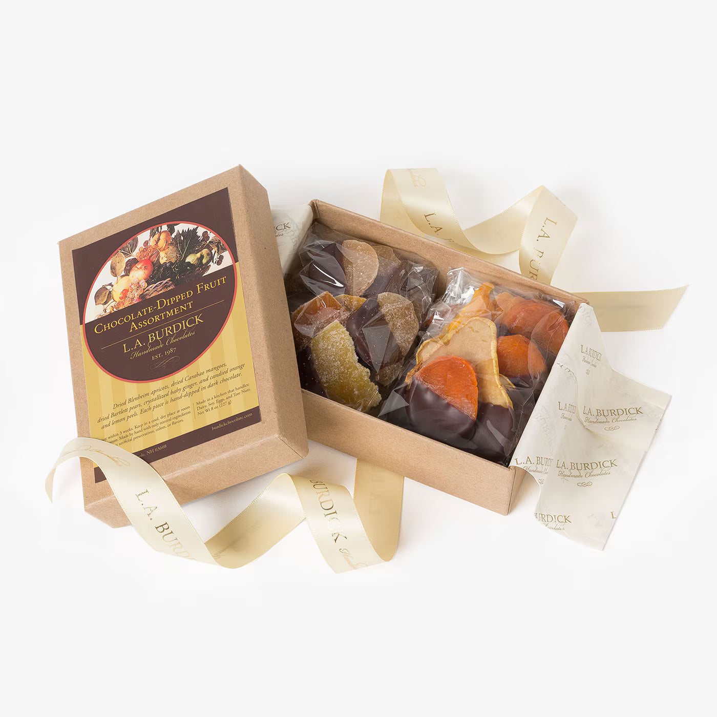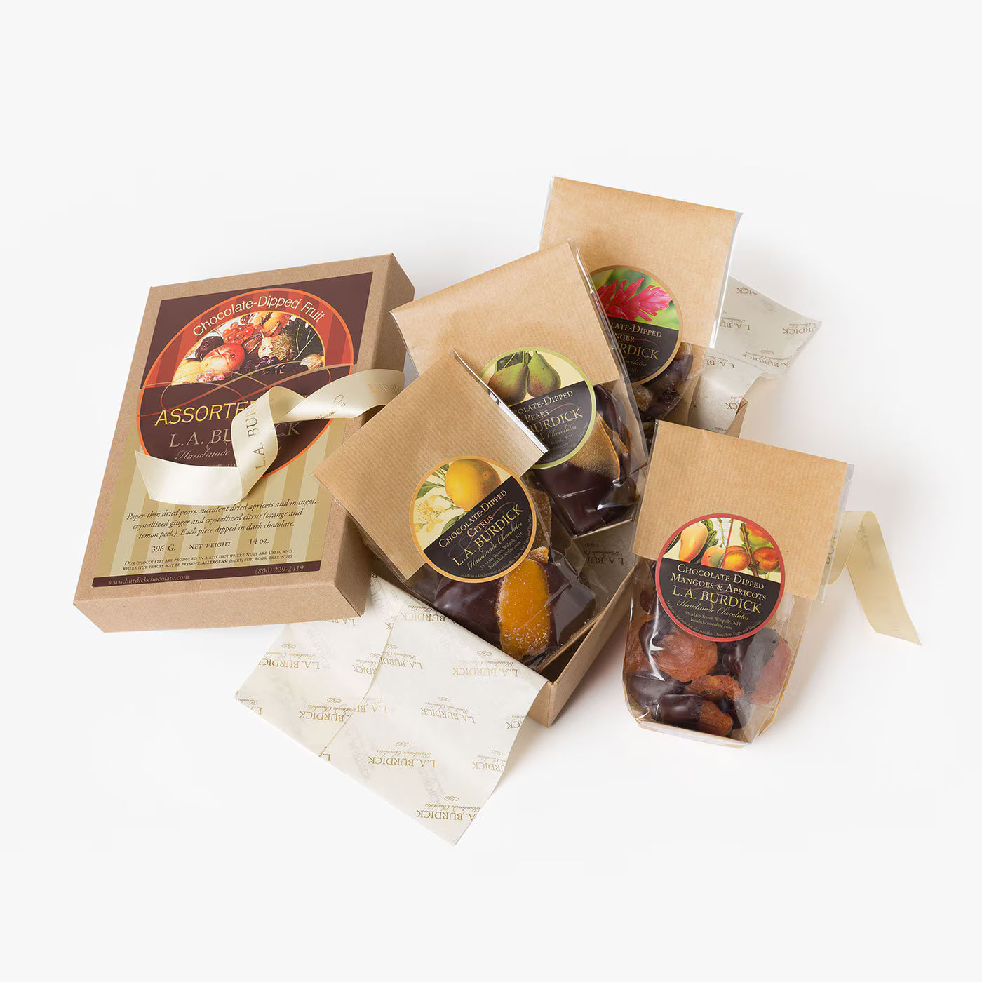 Fragrant Blenheim apricots, tender mangoes, sophisticated candied orange and lemon peels, and refreshing crystallized ginger, all hand-dipped in dark chocolate, create a delightful symphony of flavor.