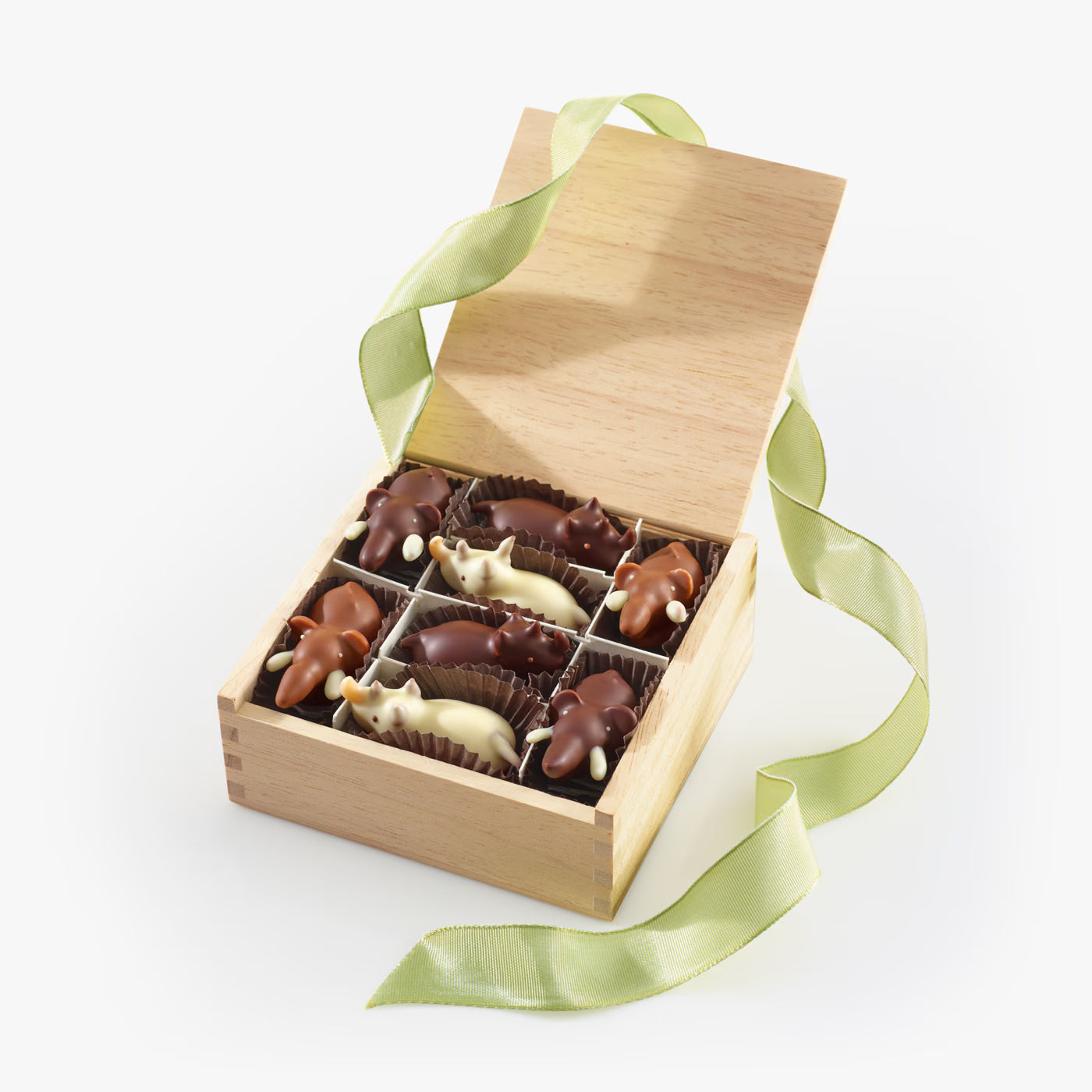 Our bonbons are crafted individually by hand, without molds, a rare and meticulous artistry. Through our Chocolate Elephants and Rhinos, this craftsmanship supports wildlife conservation. 100% of the net proceeds from this wooden gift box, filled with four Elephants and four Rhinos, are donated to Space for Giants, a Kenya-based nonprofit protecting Africa's wildlife and habitats. Available to ship now through September 19, 2025.