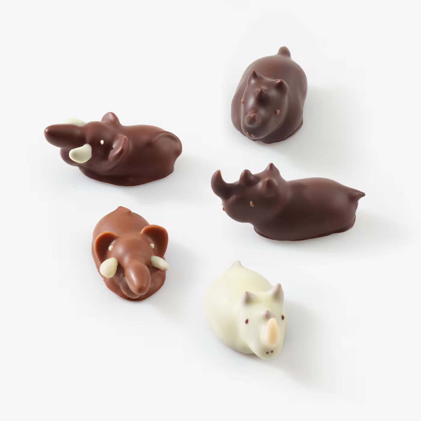 Includes 2 Dark Chocolate Elephants, 2 Milk Chocolate Elephants, 2 Dark Chocolate Rhinos, and 2 White Chocolate Rhinos.