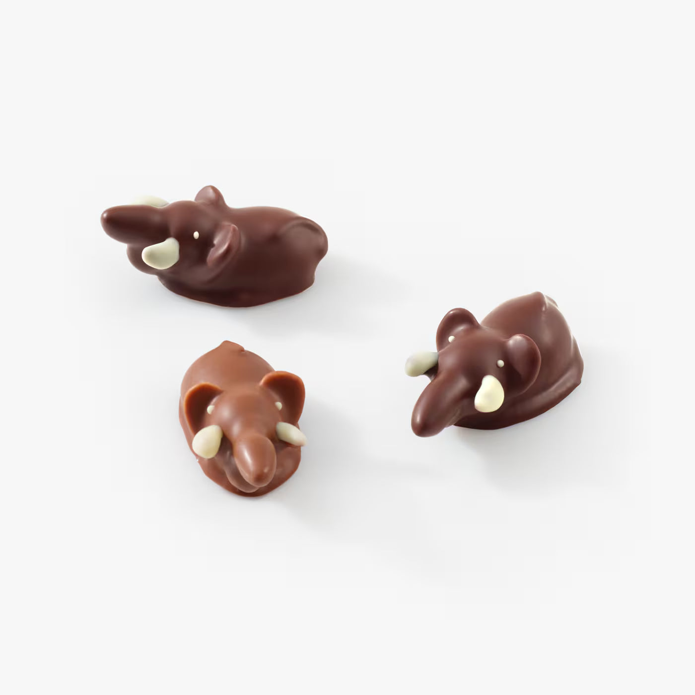 Hand-shaped with dark chocolate ganache infused with fresh mint leaves, accented with toasted almond ears and tusks and enrobed in milk chocolate