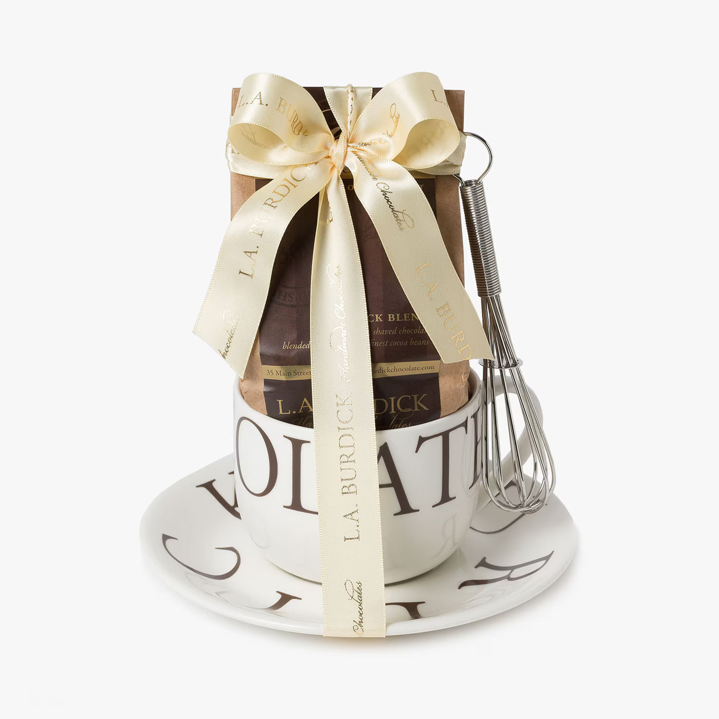 Porcelain cup and saucer set with 12 oz. Burdick Blend Dark Drinking Chocolate. Includes a miniature whisk.