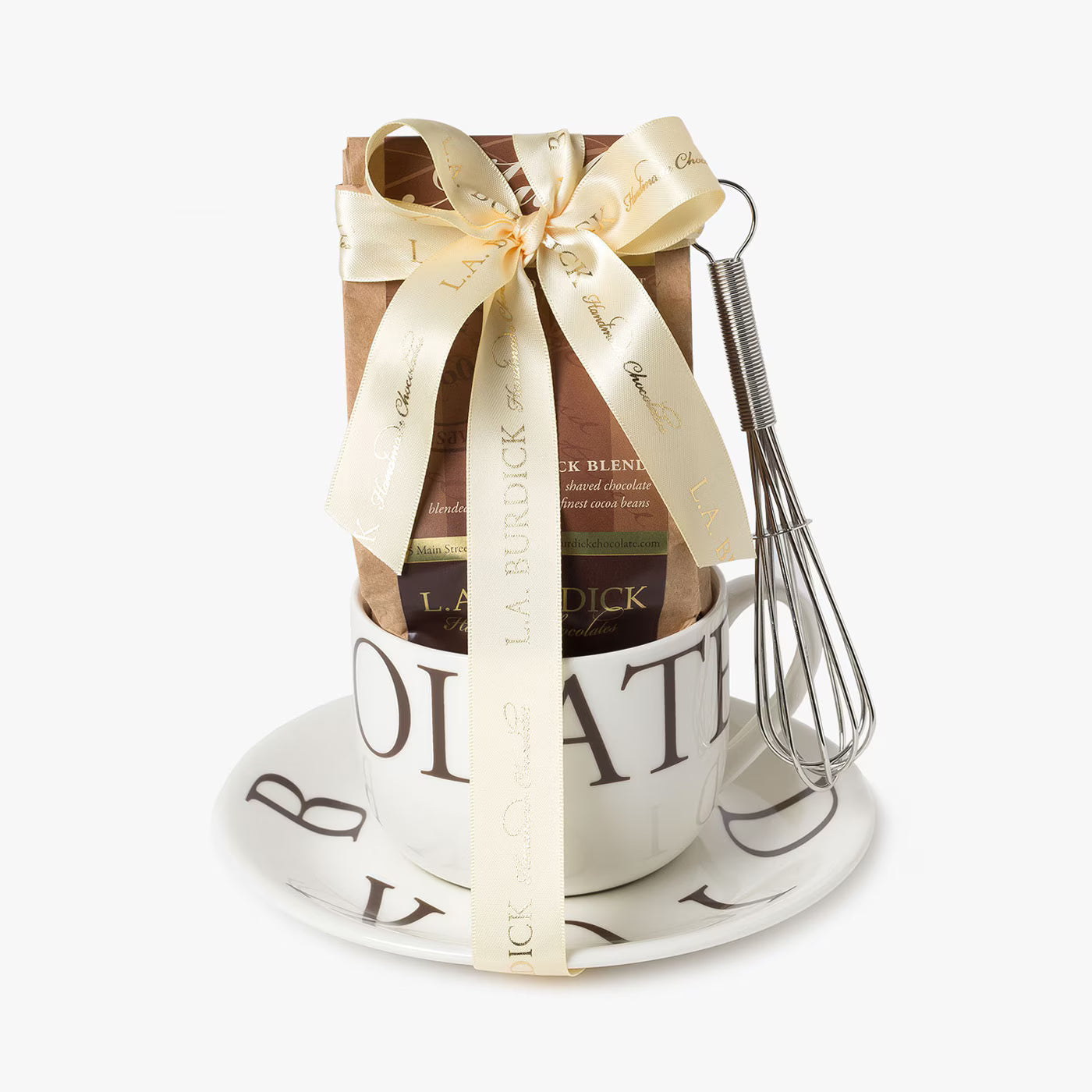 Porcelain cup and saucer set with 12 oz. Burdick Blend Milk Drinking Chocolate. Includes a miniature whisk.