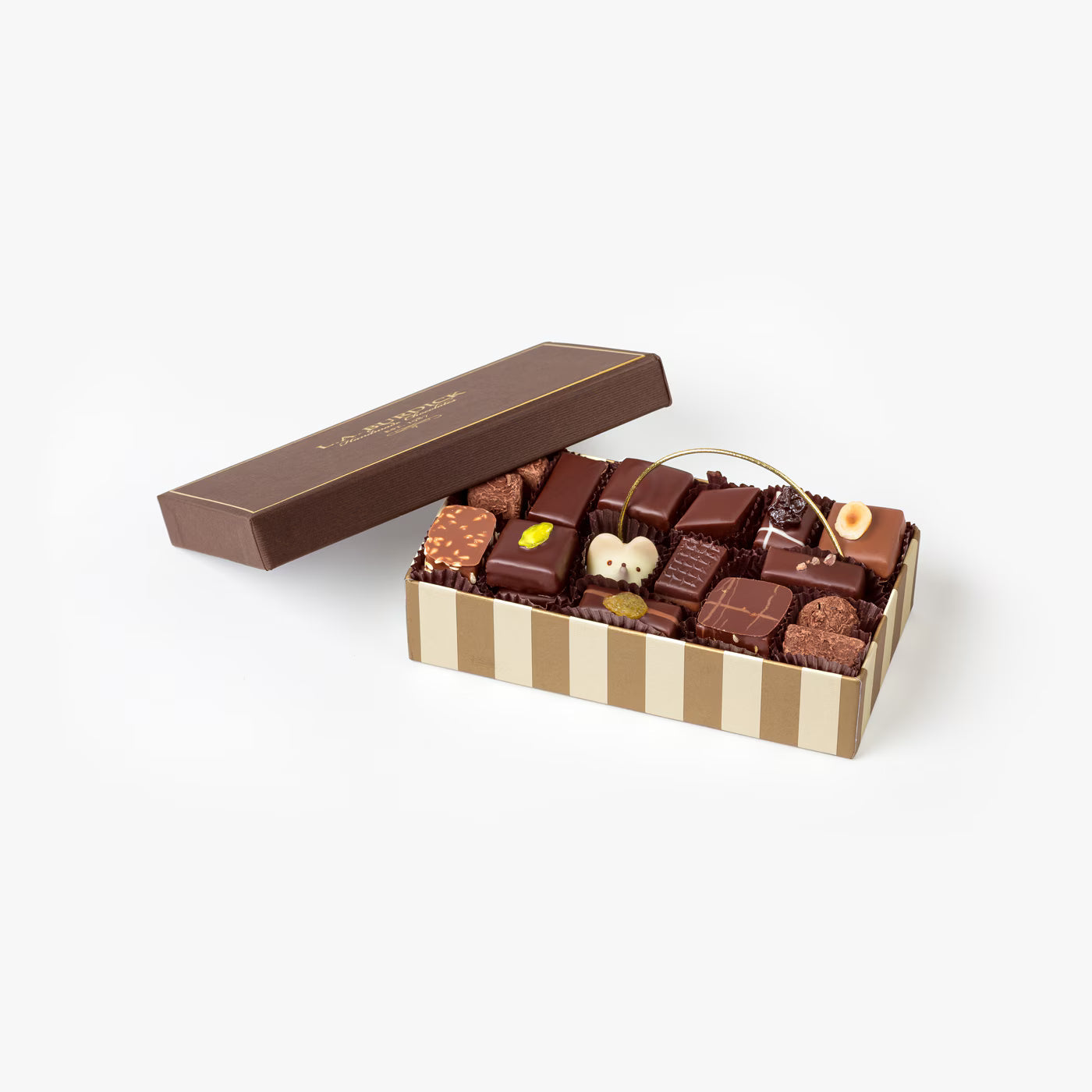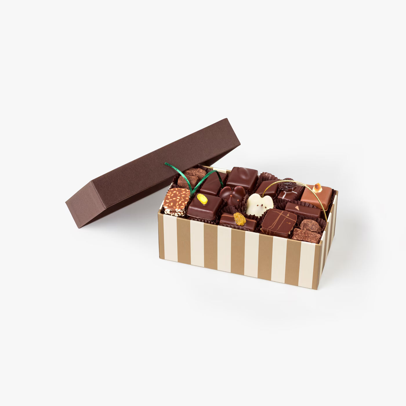 Our Everyday Assortments are filled with an array of artisan chocolates crafted in the time-honored way: cooked, cut, piped, and garnished by hand. Each assortment is presented in an elegant striped box tied with a ribbon.