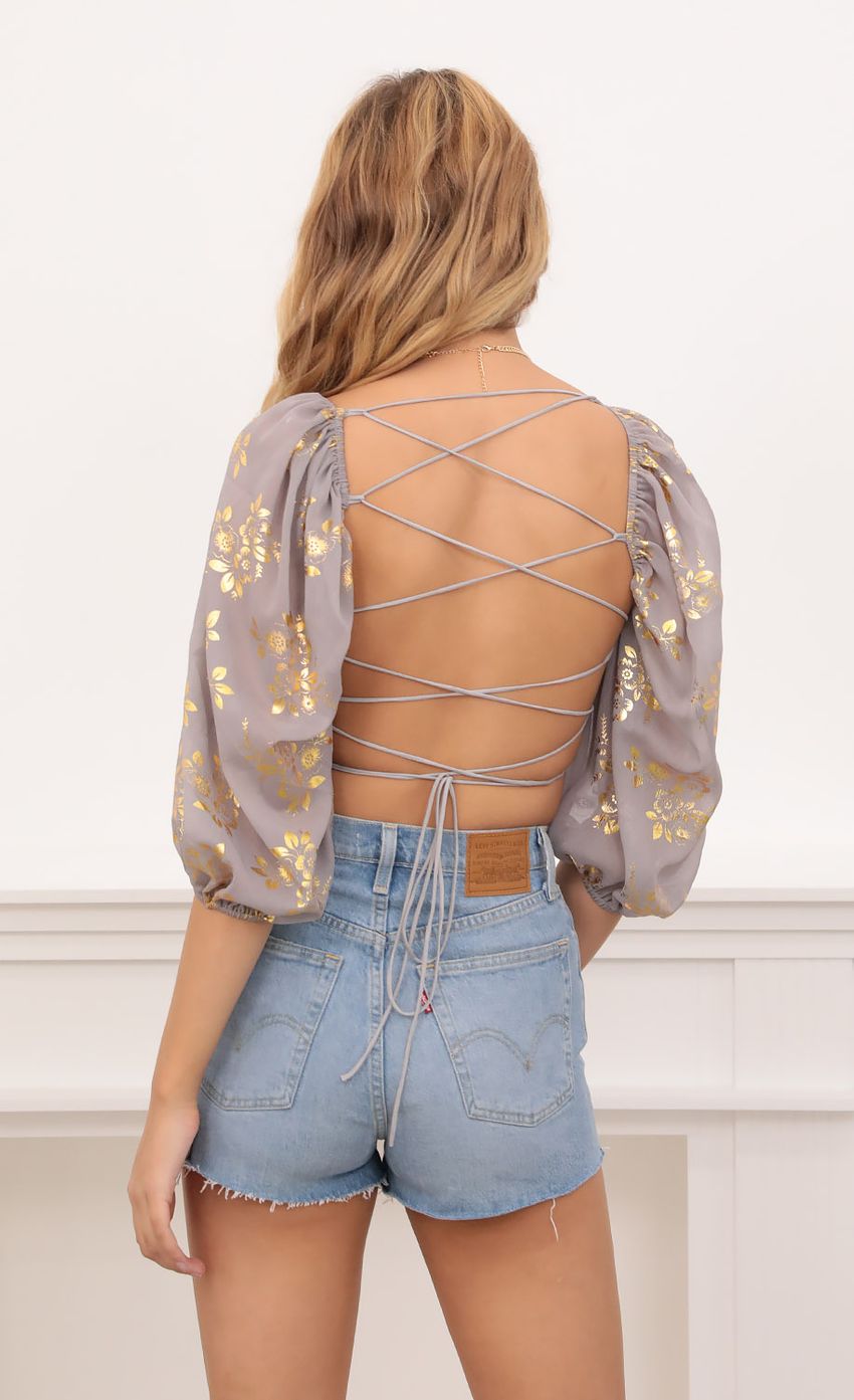What is not to love about this gorgeous polka dot ivory crop top?! Sheer chiffon ballooned sleeves and back corset tie detailing to make top as tight or loose as you want. Pair this with your favorite high-waisted skirt to give it a different look!