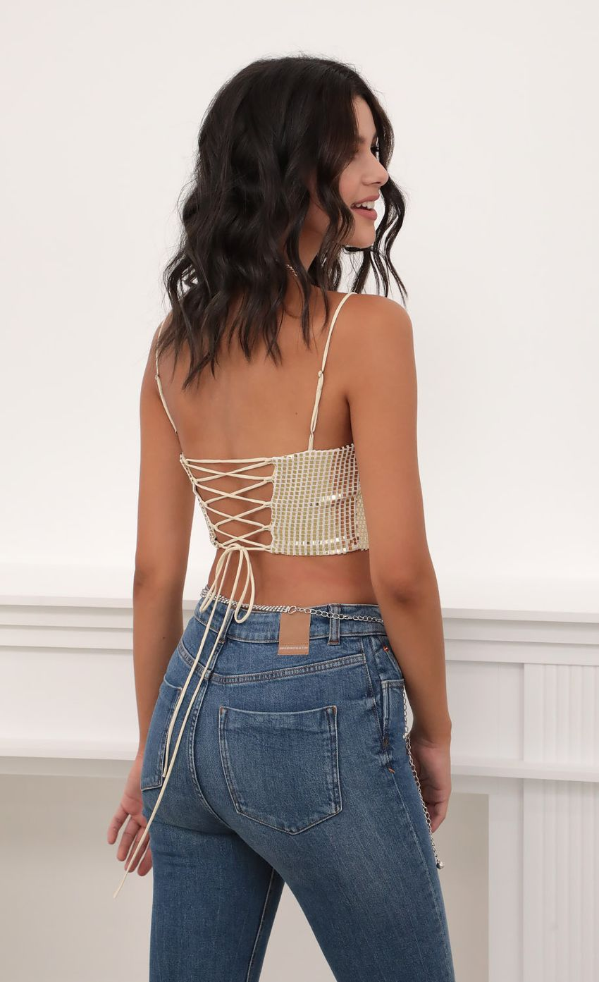 Outshine everyone in statement piece. This versatile strappy back crop top is made in our luxurious gold mirror sequin fabric that is completely exclusive.