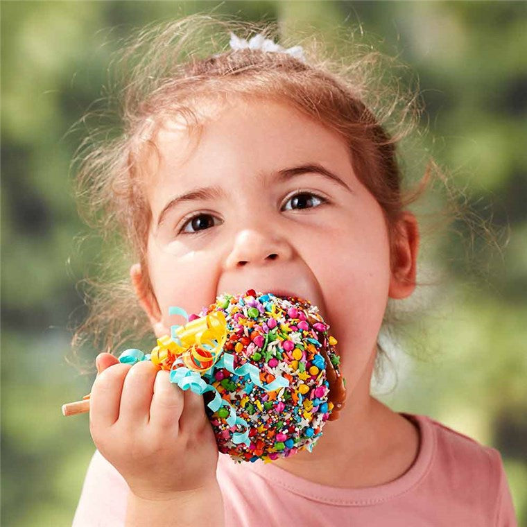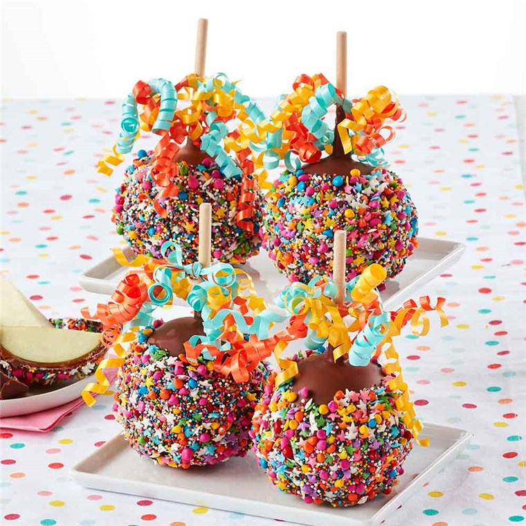 A party in a box, this gift set starts with four crisp, Granny Smith apples which are enveloped in our creamy caramel, then covered with rich milk chocolate, and decorated with colorful candy drops and festive sprinkles. These Caramel Apples make excellent party favors, as well as a colorful addition to your dessert table! Perfect for birthdays, picnics, summer parties or any occasion that call for a little fun!