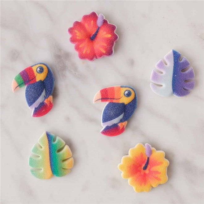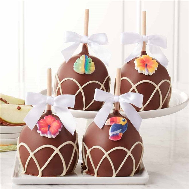 Take your taste buds on a vacation with this decadent assortment of four gourmet caramel apples. Each crisp apple is hand-dipped in buttery caramel, then coated in rich chocolate—two in creamy milk chocolate and two in bold dark chocolate. They're festively decorated with tropical-themed candies and finished with a drizzle of smooth white chocolate. A sweet escape in every bite!