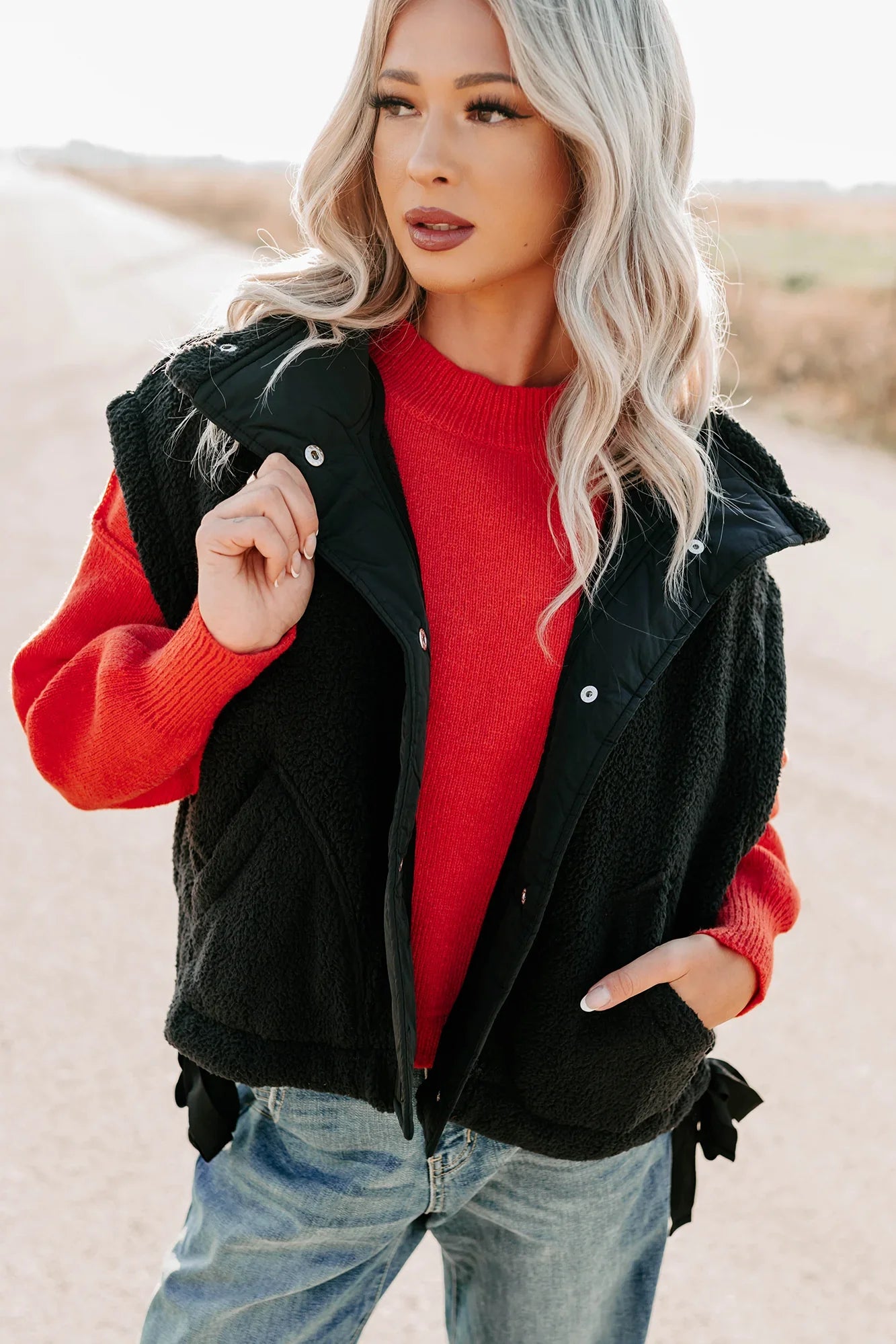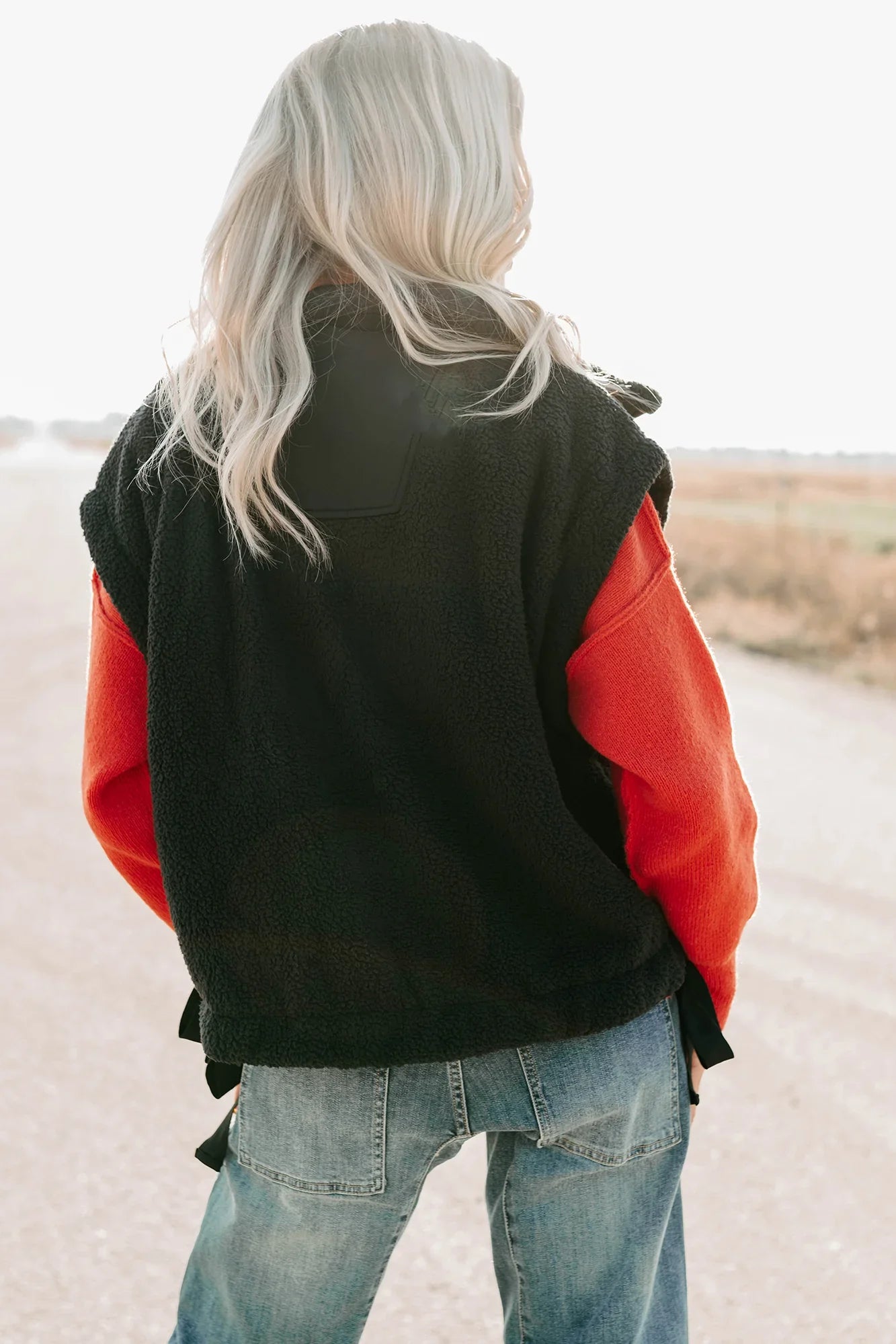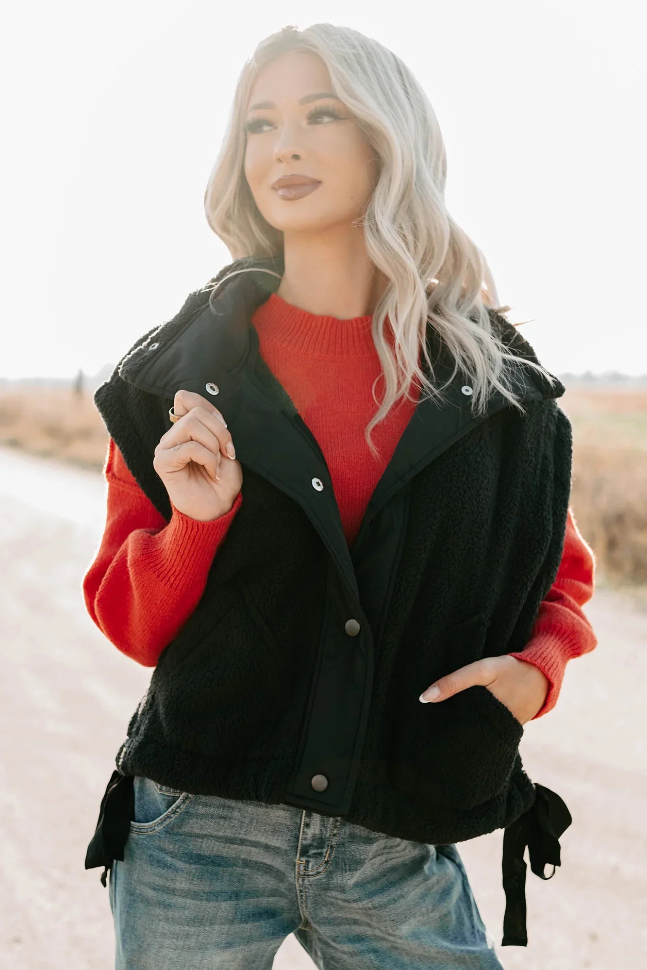 Description Model Wearing Size Small Color: Black Fleece Material Sleeveless High/Mock Neck Button-Up Front Side Tie Details Front Pockets Material Has Some Stretch 8" Armpit To Hemline 100% Polyester For Model Size Specs, Please Check Size Charts